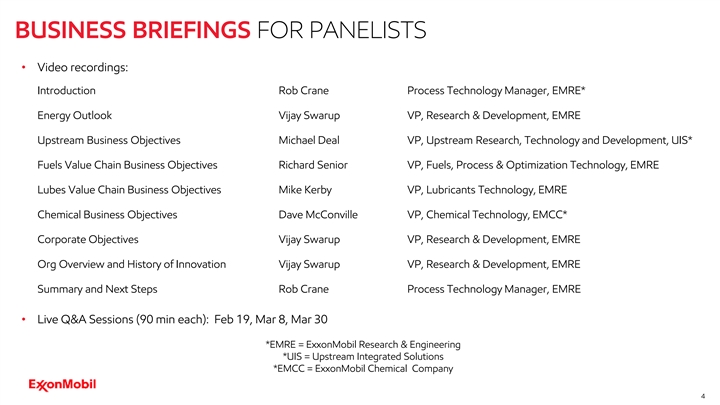 BUSINESS BRIEFINGS FOR PANELISTS • Video recordings: Introduction Rob Crane Process Technology Manager, EMRE* Energy Outlook Vijay Swarup VP, Research & Development, EMRE Upstream Business Objectives Michael Deal VP, Upstream Research, Technology and Development, UIS* Fuels Value Chain Business Objectives Richard Senior VP, Fuels, Process & Optimization Technology, EMRE Lubes Value Chain Business Objectives Mike Kerby VP, Lubricants Technology, EMRE Chemical Business Objectives Dave McConville VP, Chemical Technology, EMCC* Corporate Objectives Vijay Swarup VP, Research & Development, EMRE Org Overview and History of Innovation Vijay Swarup VP, Research & Development, EMRE Summary and Next Steps Rob Crane Process Technology Manager, EMRE • Live Q&A Sessions (90 min each): Feb 19, Mar 8, Mar 30 *EMRE = ExxonMobil Research & Engineering *UIS = Upstream Integrated Solutions *EMCC = ExxonMobil Chemical Company 4BUSINESS BRIEFINGS FOR PANELISTS • Video recordings: Introduction Rob Crane Process Technology Manager, EMRE* Energy Outlook Vijay Swarup VP, Research & Development, EMRE Upstream Business Objectives Michael Deal VP, Upstream Research, Technology and Development, UIS* Fuels Value Chain Business Objectives Richard Senior VP, Fuels, Process & Optimization Technology, EMRE Lubes Value Chain Business Objectives Mike Kerby VP, Lubricants Technology, EMRE Chemical Business Objectives Dave McConville VP, Chemical Technology, EMCC* Corporate Objectives Vijay Swarup VP, Research & Development, EMRE Org Overview and History of Innovation Vijay Swarup VP, Research & Development, EMRE Summary and Next Steps Rob Crane Process Technology Manager, EMRE • Live Q&A Sessions (90 min each): Feb 19, Mar 8, Mar 30 *EMRE = ExxonMobil Research & Engineering *UIS = Upstream Integrated Solutions *EMCC = ExxonMobil Chemical Company 4