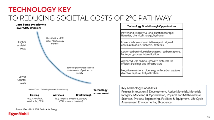 TECHNOLOGY ADVANCES NEEDED FOR EVOLVING ENERGY SYSTEM Near-term actions the Company is taking to prepare for a lower-carbon future, include: • Expanding supplies of cleaner-burning natural gas. • Improving energy efficiency in operations. • Operating and investing in carbon capture and storage. • Reducing flaring and methane emissions from operations. • Developing products, such as premium lubricants, light-weight plastics, and special tire liners to help consumers improve efficiency and reduce emissions. • Advocating for effective climate policy to address the risks of climate change at the lowest societal cost 54TECHNOLOGY ADVANCES NEEDED FOR EVOLVING ENERGY SYSTEM Near-term actions the Company is taking to prepare for a lower-carbon future, include: • Expanding supplies of cleaner-burning natural gas. • Improving energy efficiency in operations. • Operating and investing in carbon capture and storage. • Reducing flaring and methane emissions from operations. • Developing products, such as premium lubricants, light-weight plastics, and special tire liners to help consumers improve efficiency and reduce emissions. • Advocating for effective climate policy to address the risks of climate change at the lowest societal cost 54