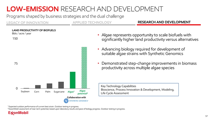 LOW-EMISSION RESEARCH AND DEVELOPMENT Programs shaped by business strategies and the dual challenge RESEARCH AND DEVELOPMENT LEGACY OF INNOVATION APPLIED TECHNOLOGY LAND PRODUCTIVITY OF BIOFUELS Bbls / acre / year • Algae represents opportunity to scale biofuels with 150 significantly higher land productivity versus alternatives • Advancing biology required for development of suitable algae strains with Synthetic Genomics 75• Demonstrated step-change improvements in biomass productivity across multiple algae species Key Technology Capabilities 0 Bioscience, Process Innovation & Development, Modeling, Algae 1 Soybean Corn Palm Sugarcane Algae 2 Life Cycle Assessment potential Collaboration with 1 Expected outdoor performance of current best strain. Outdoor testing in progress. 2 ExxonMobil assessment of near-term potential, based upon laboratory results and pace of biology progress. Outdoor testing in progress. 57LOW-EMISSION RESEARCH AND DEVELOPMENT Programs shaped by business strategies and the dual challenge RESEARCH AND DEVELOPMENT LEGACY OF INNOVATION APPLIED TECHNOLOGY LAND PRODUCTIVITY OF BIOFUELS Bbls / acre / year • Algae represents opportunity to scale biofuels with 150 significantly higher land productivity versus alternatives • Advancing biology required for development of suitable algae strains with Synthetic Genomics 75• Demonstrated step-change improvements in biomass productivity across multiple algae species Key Technology Capabilities 0 Bioscience, Process Innovation & Development, Modeling, Algae 1 Soybean Corn Palm Sugarcane Algae 2 Life Cycle Assessment potential Collaboration with 1 Expected outdoor performance of current best strain. Outdoor testing in progress. 2 ExxonMobil assessment of near-term potential, based upon laboratory results and pace of biology progress. Outdoor testing in progress. 57