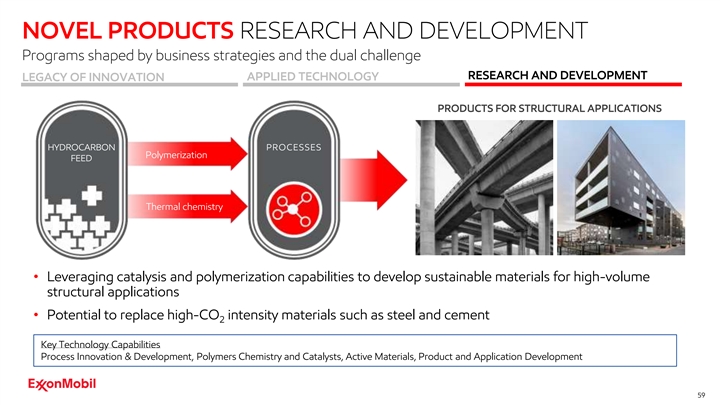 NOVEL PRODUCTS RESEARCH AND DEVELOPMENT Programs shaped by business strategies and the dual challenge RESEARCH AND DEVELOPMENT LEGACY OF INNOVATION APPLIED TECHNOLOGY PRODUCTS FOR STRUCTURAL APPLICATIONS HYDROCARBON PROCESSES Polymerization FEED Thermal chemistry • Leveraging catalysis and polymerization capabilities to develop sustainable materials for high-volume structural applications • Potential to replace high-CO intensity materials such as steel and cement 2 Key Technology Capabilities Process Innovation & Development, Polymers Chemistry and Catalysts, Active Materials, Product and Application Development 59NOVEL PRODUCTS RESEARCH AND DEVELOPMENT Programs shaped by business strategies and the dual challenge RESEARCH AND DEVELOPMENT LEGACY OF INNOVATION APPLIED TECHNOLOGY PRODUCTS FOR STRUCTURAL APPLICATIONS HYDROCARBON PROCESSES Polymerization FEED Thermal chemistry • Leveraging catalysis and polymerization capabilities to develop sustainable materials for high-volume structural applications • Potential to replace high-CO intensity materials such as steel and cement 2 Key Technology Capabilities Process Innovation & Development, Polymers Chemistry and Catalysts, Active Materials, Product and Application Development 59