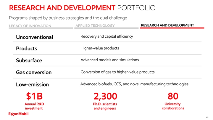 RESEARCH AND DEVELOPMENT PORTFOLIO Programs shaped by business strategies and the dual challenge RESEARCH AND DEVELOPMENT LEGACY OF INNOVATION APPLIED TECHNOLOGY Recovery and capital efficiency Unconventional Higher-value products Products Advanced models and simulations Subsurface Conversion of gas to higher-value products Gas conversion Advanced biofuels, CCS, and novel manufacturing technologies Low-emission 80 $1B 2,300 Annual R&D Ph.D. scientists University collaborations investment and engineers 61RESEARCH AND DEVELOPMENT PORTFOLIO Programs shaped by business strategies and the dual challenge RESEARCH AND DEVELOPMENT LEGACY OF INNOVATION APPLIED TECHNOLOGY Recovery and capital efficiency Unconventional Higher-value products Products Advanced models and simulations Subsurface Conversion of gas to higher-value products Gas conversion Advanced biofuels, CCS, and novel manufacturing technologies Low-emission 80 $1B 2,300 Annual R&D Ph.D. scientists University collaborations investment and engineers 61