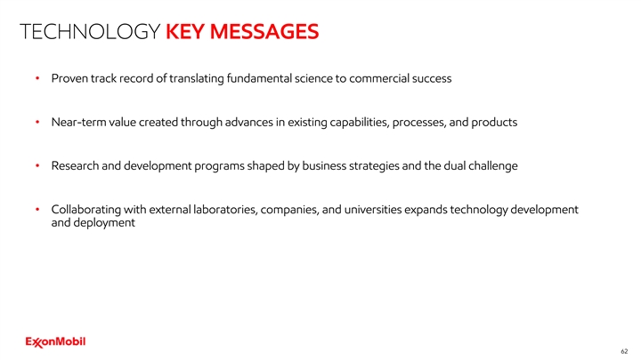 TECHNOLOGY KEY MESSAGES • Proven track record of translating fundamental science to commercial success • Near-term value created through advances in existing capabilities, processes, and products • Research and development programs shaped by business strategies and the dual challenge • Collaborating with external laboratories, companies, and universities expands technology development and deployment 62TECHNOLOGY KEY MESSAGES • Proven track record of translating fundamental science to commercial success • Near-term value created through advances in existing capabilities, processes, and products • Research and development programs shaped by business strategies and the dual challenge • Collaborating with external laboratories, companies, and universities expands technology development and deployment 62