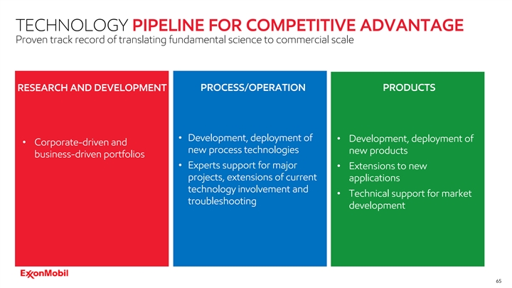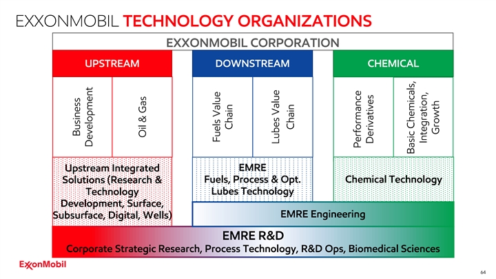 EXXONMOBIL TECHNOLOGY ORGANIZATIONS EXXONMOBIL CORPORATION UPSTREAM DOWNSTREAM CHEMICAL EMRE Upstream Integrated Fuels, Process & Opt. Chemical Technology Solutions (Research & Technology Lubes Technology Development, Surface, EMRE Engineering Subsurface, Digital, Wells) EMRE R&D Corporate Strategic Research, Process Technology, R&D Ops, Biomedical Sciences 64 Business Development Oil & Gas Fuels Value Chain Lubes Value Chain Performance Derivatives Basic Chemicals, Integration, GrowthEXXONMOBIL TECHNOLOGY ORGANIZATIONS EXXONMOBIL CORPORATION UPSTREAM DOWNSTREAM CHEMICAL EMRE Upstream Integrated Fuels, Process & Opt. Chemical Technology Solutions (Research & Technology Lubes Technology Development, Surface, EMRE Engineering Subsurface, Digital, Wells) EMRE R&D Corporate Strategic Research, Process Technology, R&D Ops, Biomedical Sciences 64 Business Development Oil & Gas Fuels Value Chain Lubes Value Chain Performance Derivatives Basic Chemicals, Integration, Growth