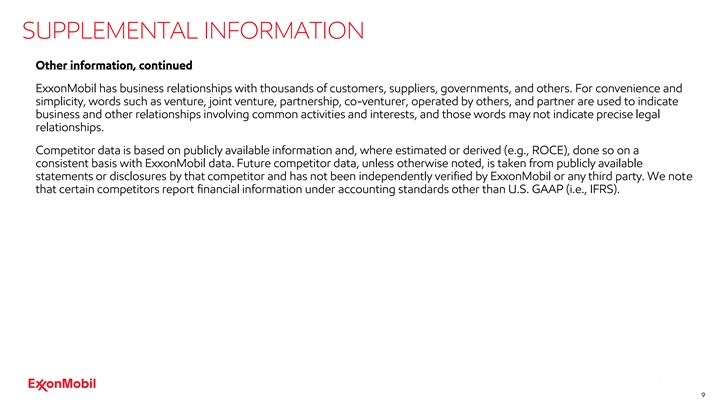 SUPPLEMENTAL INFORMATION Other information, continued ExxonMobil has business relationships with thousands of customers, suppliers, governments, and others. For convenience and simplicity, words such as venture, joint venture, partnership, co-venturer, operated by others, and partner are used to indicate business and other relationships involving common activities and interests, and those words may not indicate precise legal relationships. Competitor data is based on publicly available information and, where estimated or derived (e.g., ROCE), done so on a consistent basis with ExxonMobil data. Future competitor data, unless otherwise noted, is taken from publicly available statements or disclosures by that competitor and has not been independently verified by ExxonMobil or any third party. We note that certain competitors report financial information under accounting standards other than U.S. GAAP (i.e., IFRS). 9SUPPLEMENTAL INFORMATION Other information, continued ExxonMobil has business relationships with thousands of customers, suppliers, governments, and others. For convenience and simplicity, words such as venture, joint venture, partnership, co-venturer, operated by others, and partner are used to indicate business and other relationships involving common activities and interests, and those words may not indicate precise legal relationships. Competitor data is based on publicly available information and, where estimated or derived (e.g., ROCE), done so on a consistent basis with ExxonMobil data. Future competitor data, unless otherwise noted, is taken from publicly available statements or disclosures by that competitor and has not been independently verified by ExxonMobil or any third party. We note that certain competitors report financial information under accounting standards other than U.S. GAAP (i.e., IFRS). 9