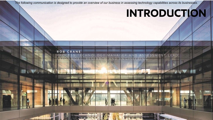The following communication is designed to provide an overview of our business in assessing technology capabilities across its businesses. INTRODUCTION R O B C R A N E P R O C E S S T E C H N O L O G Y M A N A G E R A N D A S S E S S M E N T L E A D , E X X O N M O B I L R E S E A R C H A N D E N G I N E E R I N G 1The following communication is designed to provide an overview of our business in assessing technology capabilities across its businesses. INTRODUCTION R O B C R A N E P R O C E S S T E C H N O L O G Y M A N A G E R A N D A S S E S S M E N T L E A D , E X X O N M O B I L R E S E A R C H A N D E N G I N E E R I N G 1