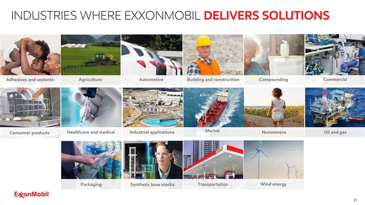 INDUSTRIES WHERE EXXONMOBIL DELIVERS SOLUTIONS Adhesives and sealants Agriculture Automotive Building and construction Compounding Commercial Marine Healthcare and medical Industrial applications Nonwovens Oil and gas Consumer products Packaging Transportation Wind energy Synthetic base stocks 21INDUSTRIES WHERE EXXONMOBIL DELIVERS SOLUTIONS Adhesives and sealants Agriculture Automotive Building and construction Compounding Commercial Marine Healthcare and medical Industrial applications Nonwovens Oil and gas Consumer products Packaging Transportation Wind energy Synthetic base stocks 21