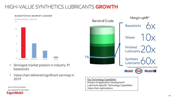 HIGH-VALUE SYNTHETICS LUBRICANTS GROWTH Margin uplift* Barrel of Crude Basestocks 6x Waxes 10x Finished Lubricants 20x 1% Synthetic Lubricants60x • Strongest market position in industry: #1 * versus average ExxonMobil refinery margin basestocks • Value chain delivered significant earnings in 2019 Key Technology Capabilities Product & Application Development Lubricants-Specific Technology Capabilities Source: Kline & Company Value chain optimization See supplemental information 44HIGH-VALUE SYNTHETICS LUBRICANTS GROWTH Margin uplift* Barrel of Crude Basestocks 6x Waxes 10x Finished Lubricants 20x 1% Synthetic Lubricants60x • Strongest market position in industry: #1 * versus average ExxonMobil refinery margin basestocks • Value chain delivered significant earnings in 2019 Key Technology Capabilities Product & Application Development Lubricants-Specific Technology Capabilities Source: Kline & Company Value chain optimization See supplemental information 44