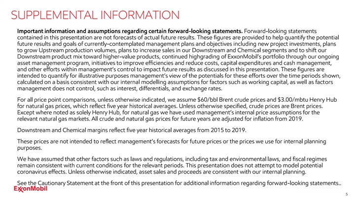 SUPPLEMENTAL INFORMATION Important information and assumptions regarding certain forward-looking statements. Forward-looking statements contained in this presentation are not forecasts of actual future results. These figures are provided to help quantify the potential future results and goals of currently-contemplated management plans and objectives including new project investments, plans to grow Upstream production volumes, plans to increase sales in our Downstream and Chemical segments and to shift our Downstream product mix toward higher-value products, continued highgrading of ExxonMobil’s portfolio through our ongoing asset management program, initiatives to improve efficiencies and reduce costs, capital expenditures and cash management, and other efforts within management’s control to impact future results as discussed in this presentation. These figures are intended to quantify for illustrative purposes management’s view of the potentials for these efforts over the time periods shown, calculated on a basis consistent with our internal modelling assumptions for factors such as working capital, as well as factors management does not control, such as interest, differentials, and exchange rates. For all price point comparisons, unless otherwise indicated, we assume $60/bbl Brent crude prices and $3.00/mbtu Henry Hub for natural gas prices, which reflect five year historical averages. Unless otherwise specified, crude prices are Brent prices. Except where noted as solely Henry Hub, for natural gas we have used management’s internal price assumptions for the relevant natural gas markets. All crude and natural gas prices for future years are adjusted for inflation from 2019. Downstream and Chemical margins reflect five year historical averages from 2015 to 2019. These prices are not intended to reflect management’s forecasts for future prices or the prices we use for internal planning purposes. We have assumed that other factors such as laws and regulations, including tax and environmental laws, and fiscal regimes remain consistent with current conditions for the relevant periods. This presentation does not attempt to model potential coronavirus effects. Unless otherwise indicated, asset sales and proceeds are consistent with our internal planning. See the Cautionary Statement at the front of this presentation for additional information regarding forward-looking statements.. 5SUPPLEMENTAL INFORMATION Important information and assumptions regarding certain forward-looking statements. Forward-looking statements contained in this presentation are not forecasts of actual future results. These figures are provided to help quantify the potential future results and goals of currently-contemplated management plans and objectives including new project investments, plans to grow Upstream production volumes, plans to increase sales in our Downstream and Chemical segments and to shift our Downstream product mix toward higher-value products, continued highgrading of ExxonMobil’s portfolio through our ongoing asset management program, initiatives to improve efficiencies and reduce costs, capital expenditures and cash management, and other efforts within management’s control to impact future results as discussed in this presentation. These figures are intended to quantify for illustrative purposes management’s view of the potentials for these efforts over the time periods shown, calculated on a basis consistent with our internal modelling assumptions for factors such as working capital, as well as factors management does not control, such as interest, differentials, and exchange rates. For all price point comparisons, unless otherwise indicated, we assume $60/bbl Brent crude prices and $3.00/mbtu Henry Hub for natural gas prices, which reflect five year historical averages. Unless otherwise specified, crude prices are Brent prices. Except where noted as solely Henry Hub, for natural gas we have used management’s internal price assumptions for the relevant natural gas markets. All crude and natural gas prices for future years are adjusted for inflation from 2019. Downstream and Chemical margins reflect five year historical averages from 2015 to 2019. These prices are not intended to reflect management’s forecasts for future prices or the prices we use for internal planning purposes. We have assumed that other factors such as laws and regulations, including tax and environmental laws, and fiscal regimes remain consistent with current conditions for the relevant periods. This presentation does not attempt to model potential coronavirus effects. Unless otherwise indicated, asset sales and proceeds are consistent with our internal planning. See the Cautionary Statement at the front of this presentation for additional information regarding forward-looking statements.. 5