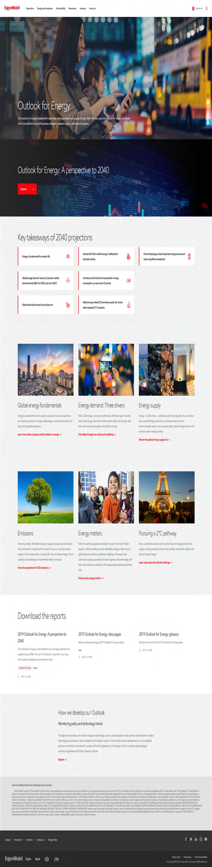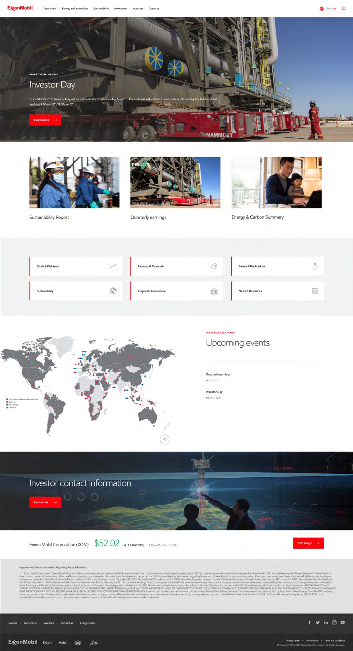 Exxon Mobil Corporation (ExxonMobil) intends to file a proxy statement and associated BLUE proxy card with the U.S. Securities and Exchange Commission (the SEC) in connection with the solicitation of proxies for ExxonMobils 2021 Annual Meeting (the Proxy Statement). ExxonMobil, its directors and certain of its executive officers will be participants in the solicitation of proxies from shareholders in respect of the 2021 Annual Meeting. Information regarding the names of ExxonMobils directors and executive officers and their respective interests in ExxonMobil by security holdings or otherwise is set forth in ExxonMobils Annual Report on Form 10-K for the fiscal year ended December 31, 2019, filed with the SEC on February 26, 2020, ExxonMobils proxy statement for the 2020 Annual Meeting of Shareholders, filed with the SEC on April 9, 2020, ExxonMobils Form 8-K filed with the SEC on December 1, 2020 and ExxonMobils Form 8-K filed with the SEC on February 2, 2021. To the extent holdings of such participants in ExxonMobils securities are not reported, or have changed since the amounts described, in the 2020 proxy statement, such changes have been reflected on Initial Statements of Beneficial Ownership on Form 3 or Statements of Change in Ownership on Form 4 filed with the SEC. Details concerning the nominees of ExxonMobils Board of Directors for election at the 2021 Annual Meeting will be included in the Proxy Statement. BEFORE MAKING ANY VOTING DECISION, INVESTORS AND SHAREHOLDERS OF THE COMPANY ARE URGED TO READ ALL RELEVANT DOCUMENTS FILED WITH OR FURNISHED TO THE SEC, INCLUDING THE COMPANYS DEFINITIVE PROXY STATEMENT AND ANY SUPPLEMENTS THERETO AND ACCOMPANYING BLUE PROXY CARD WHEN THEY BECOME AVAILABLE, BECAUSE THEY WILL CONTAIN IMPORTANT INFORMATION. Investors and shareholders will be able to obtain a copy of the definitive Proxy Statement and other relevant documents filed by ExxonMobil free of charge from the SECs website, www.sec.gov. ExxonMobils shareholders will also be able to obtain, without charge, a copy of the definitive Proxy Statement and other relevant filed documents by directing a request by mail to ExxonMobil Shareholder Services at 5959 Las Colinas Boulevard, Irving, Texas, 75039-2298 or at shareholderrelations@exxonmobil.com or from the investor relations section of ExxonMobils website, www.exxonmobil.com/investor.