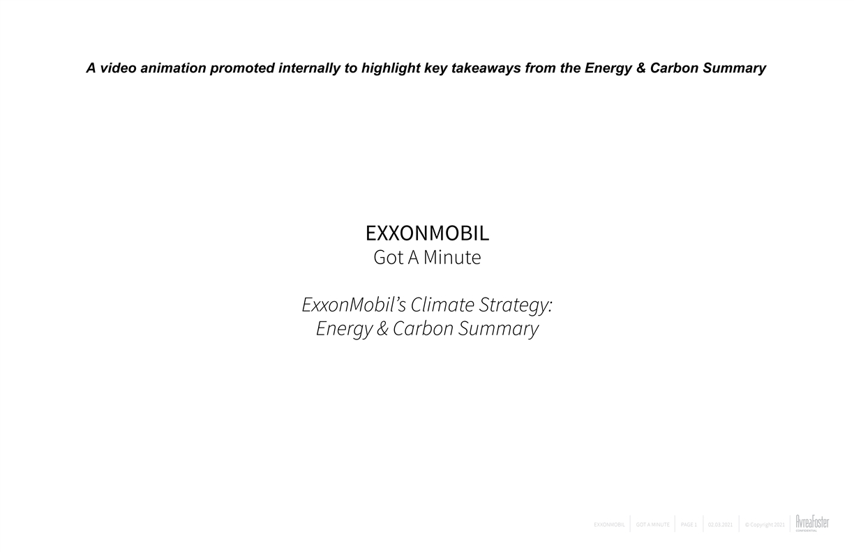 A video animation promoted internally to highlight key takeaways from the Energy & Carbon Summary EXXONMOBIL Got A Minute ExxonMobil’s Climate Strategy: Energy & Carbon Summary EXXONMOBIL GOT A MINUTE PAGE 1 02.03.2021 © Copyright 2021 | | | | |A video animation promoted internally to highlight key takeaways from the Energy & Carbon Summary EXXONMOBIL Got A Minute ExxonMobil’s Climate Strategy: Energy & Carbon Summary EXXONMOBIL GOT A MINUTE PAGE 1 02.03.2021 © Copyright 2021 | | | | |
