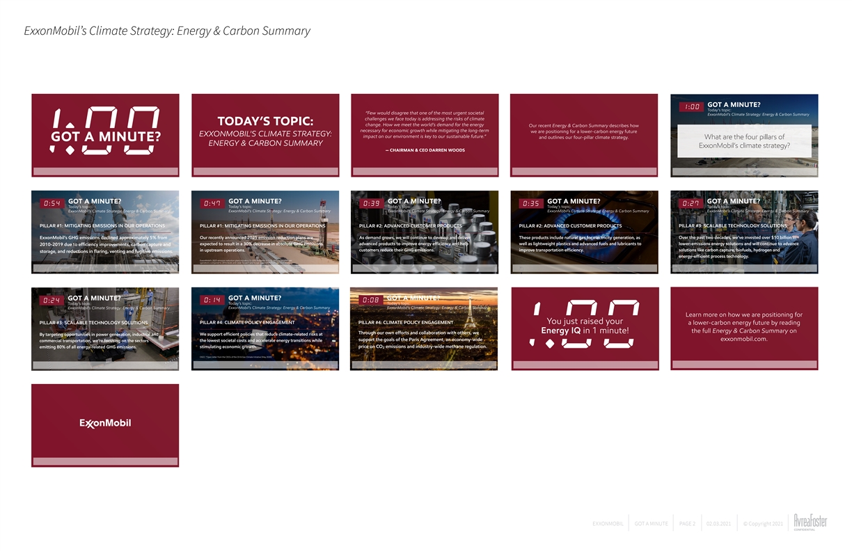 ExxonMobil’s Climate Strategy: Energy & Carbon Summary GOT A MINUTE? 1:00 Today’s topic: “Few would disagree that one of the most urgent societal ExxonMobil’s Climate Strategy: Energy & Carbon Summary challenges we face today is addressing the risks of climate TODAY’S TOPIC: change. How we meet the world’s demand for the energy Our recent Energy & Carbon Summary describes how necessary for economic growth while mitigating the long-term we are positioning for a lower-carbon energy future EXXONMOBIL'S CLIMATE STRATEGY: impact on our environment is key to our sustainable future.” and outlines our four-pillar climate strategy. What are the four pillars of GOT A MINUTE? ENERGY & CARBON SUMMARY ExxonMobil’s climate strategy? — CHAIRMAN & CEO DARREN WOODS Compared to 2016 levels. GOT A MINUTE? GOT A MINUTE? GOT A MINUTE? GOT A MINUTE? GOT A MINUTE? 0:54 0:47 0:39 0:35 0:27 Today’s topic: Today’s topic: Today’s topic: Today’s topic: Today’s topic: ExxonMobil’s Climate Strategy: Energy & Carbon Summary ExxonMobil’s Climate Strategy: Energy & Carbon Summary ExxonMobil’s Climate Strategy: Energy & Carbon Summary ExxonMobil’s Climate Strategy: Energy & Carbon Summary ExxonMobil’s Climate Strategy: Energy & Carbon Summary PILLAR #1: MITIGATING EMISSIONS IN OUR OPERATIONS PILLAR #1: MITIGATING EMISSIONS IN OUR OPERATIONS PILLAR #2: ADVANCED CUSTOMER PRODUCTS PILLAR #2: ADVANCED CUSTOMER PRODUCTS PILLAR #3: SCALABLE TECHNOLOGY SOLUTIONS ExxonMobil’s GHG emissions declined approximately 5% from Our recently announced 2025 emission reduction plans are As demand grows, we will continue to develop and deliver These products include natural gas for electricity generation, as Over the past two decades, we’ve invested over $10 billion in expected to result in a 30% decrease in absolute GHG emissions advanced products to improve energy efficiency and help well as lightweight plastics and advanced fuels and lubricants to lower-emissions energy solutions and will continue to advance 2010-2019 due to efficiency improvements, carbon capture and solutions like carbon capture, biofuels, hydrogen and in upstream operations. customers reduce their GHG emissions. improve transportation efficiency. storage, and reductions in flaring, venting and fugitive emissions. energy-efficient process technology. ExxonMobil’s 2025 emission reduction plans include a 15-20% reduction in GHG intensity of upstream operations compared to 2016 levels and cover Scope 1 and Scope 2 emissions from operated assets. GOT A MINUTE? GOT A MINUTE? GOT A MINUTE? 0:24 0:14 0:08 Today’s topic: Today’s topic: Today’s topic: ExxonMobil’s Climate Strategy: Energy & Carbon Summary ExxonMobil’s Climate Strategy: Energy & Carbon Summary ExxonMobil’s Climate Strategy: Energy & Carbon Summary Learn more on how we are positioning for PILLAR #3: SCALABLE TECHNOLOGY SOLUTIONS PILLAR #4: CLIMATE POLICY ENGAGEMENT PILLAR #4: CLIMATE POLICY ENGAGEMENT You just raised your a lower-carbon energy future by reading the full Energy & Carbon Summary on Energy IQ in 1 minute! Through our own efforts and collaboration with others, we We support efficient policies that reduce climate-related risks at By targeting opportunities in power generation, industrial and support the goals of the Paris Agreement, an economy-wide exxonmobil.com. the lowest societal costs and accelerate energy transitions while commercial transportation, we’re focusing on the sectors stimulating economic growth. price on CO₂ emissions and industry-wide methane regulation. emitting 80% of all energy-related GHG emissions. OGCI: “Open letter from the CEOs of the Oil & Gas Climate Initiative (May 2020) EXXONMOBIL GOT A MINUTE PAGE 2 02.03.2021 © Copyright 2021 | | | | |ExxonMobil’s Climate Strategy: Energy & Carbon Summary GOT A MINUTE? 1:00 Today’s topic: “Few would disagree that one of the most urgent societal ExxonMobil’s Climate Strategy: Energy & Carbon Summary challenges we face today is addressing the risks of climate TODAY’S TOPIC: change. How we meet the world’s demand for the energy Our recent Energy & Carbon Summary describes how necessary for economic growth while mitigating the long-term we are positioning for a lower-carbon energy future EXXONMOBIL'S CLIMATE STRATEGY: impact on our environment is key to our sustainable future.” and outlines our four-pillar climate strategy. What are the four pillars of GOT A MINUTE? ENERGY & CARBON SUMMARY ExxonMobil’s climate strategy? — CHAIRMAN & CEO DARREN WOODS Compared to 2016 levels. GOT A MINUTE? GOT A MINUTE? GOT A MINUTE? GOT A MINUTE? GOT A MINUTE? 0:54 0:47 0:39 0:35 0:27 Today’s topic: Today’s topic: Today’s topic: Today’s topic: Today’s topic: ExxonMobil’s Climate Strategy: Energy & Carbon Summary ExxonMobil’s Climate Strategy: Energy & Carbon Summary ExxonMobil’s Climate Strategy: Energy & Carbon Summary ExxonMobil’s Climate Strategy: Energy & Carbon Summary ExxonMobil’s Climate Strategy: Energy & Carbon Summary PILLAR #1: MITIGATING EMISSIONS IN OUR OPERATIONS PILLAR #1: MITIGATING EMISSIONS IN OUR OPERATIONS PILLAR #2: ADVANCED CUSTOMER PRODUCTS PILLAR #2: ADVANCED CUSTOMER PRODUCTS PILLAR #3: SCALABLE TECHNOLOGY SOLUTIONS ExxonMobil’s GHG emissions declined approximately 5% from Our recently announced 2025 emission reduction plans are As demand grows, we will continue to develop and deliver These products include natural gas for electricity generation, as Over the past two decades, we’ve invested over $10 billion in expected to result in a 30% decrease in absolute GHG emissions advanced products to improve energy efficiency and help well as lightweight plastics and advanced fuels and lubricants to lower-emissions energy solutions and will continue to advance 2010-2019 due to efficiency improvements, carbon capture and solutions like carbon capture, biofuels, hydrogen and in upstream operations. customers reduce their GHG emissions. imp