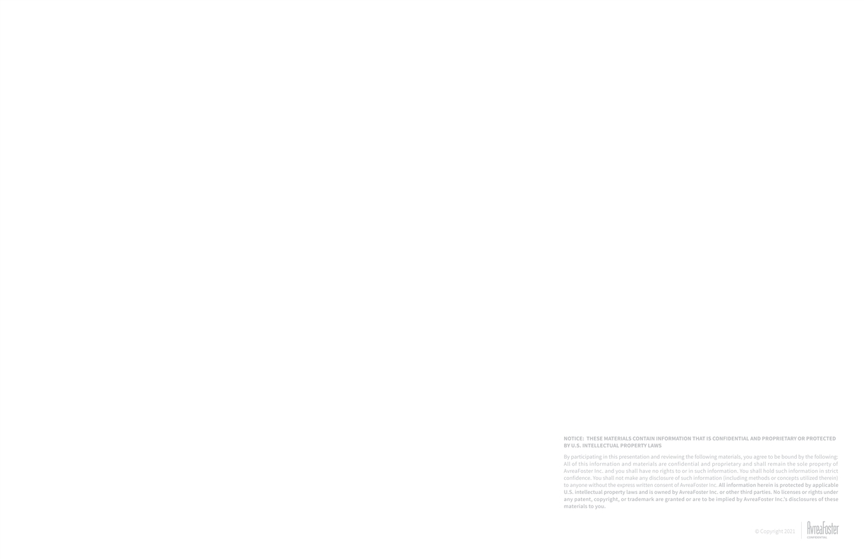 NOTICE: THESE MATERIALS CONTAIN INFORMATION THAT IS CONFIDENTIAL AND PROPRIETARY OR PROTECTED BY U.S. INTELLECTUAL PROPERTY LAWS By participating in this presentation and reviewing the following materials, you agree to be bound by the following: All of this information and materials are confidential and proprietary and shall remain the sole property of AvreaFoster Inc. and you shall have no rights to or in such information. You shall hold such information in strict confidence. You shall not make any disclosure of such information (including methods or concepts utilized therein) to anyone without the express written consent of AvreaFoster Inc. All information herein is protected by applicable U.S. intellectual property laws and is owned by AvreaFoster Inc. or other third parties. No licenses or rights under any patent, copyright, or trademark are granted or are to be implied by AvreaFoster Inc.’s disclosures of these materials to you. © Copyright 2021 |NOTICE: THESE MATERIALS CONTAIN INFORMATION THAT IS CONFIDENTIAL AND PROPRIETARY OR PROTECTED BY U.S. INTELLECTUAL PROPERTY LAWS By participating in this presentation and reviewing the following materials, you agree to be bound by the following: All of this information and materials are confidential and proprietary and shall remain the sole property of AvreaFoster Inc. and you shall have no rights to or in such information. You shall hold such information in strict confidence. You shall not make any disclosure of such information (including methods or concepts utilized therein) to anyone without the express written consent of AvreaFoster Inc. All information herein is protected by applicable U.S. intellectual property laws and is owned by AvreaFoster Inc. or other third parties. No licenses or rights under any patent, copyright, or trademark are granted or are to be implied by AvreaFoster Inc.’s disclosures of these materials to you. © Copyright 2021 |