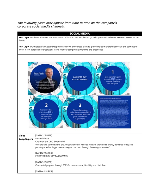 The following posts may appear from time to time on the company’s corporate social media channels. SOCIAL MEDIA Post Copy: We delivered on our commitments in 2020 and outlined plans to grow long-term shareholder value in a lower-carbon future. Post Copy: During today’s Investor Day presentation we announced plans to grow long-term shareholder value and continue to invest in low-carbon energy solutions in line with our competitive strengths and experience. [CARD 1/ SUPER] Video Darren Woods Copy/Supers Chairman and CEO ExxonMobil “We are fully committed to growing shareholder value by meeting the world’s energy demands today and pursuing a technology-driven strategy to succeed through the energy transition.” [CARD 2 / SUPER] INVESTOR DAY KEY TAKEAWAYS [CARD 3 /SUPER] Our capital program through 2025 focuses on value, flexibility and discipline. [CARD 4 / SUPER] The following posts may appear from time to time on the company’s corporate social media channels. SOCIAL MEDIA Post Copy: We delivered on our commitments in 2020 and outlined plans to grow long-term shareholder value in a lower-carbon future. Post Copy: During today’s Investor Day presentation we announced plans to grow long-term shareholder value and continue to invest in low-carbon energy solutions in line with our competitive strengths and experience. [CARD 1/ SUPER] Video Darren Woods Copy/Supers Chairman and CEO ExxonMobil “We are fully committed to growing shareholder value by meeting the world’s energy demands today and pursuing a technology-driven strategy to succeed through the energy transition.” [CARD 2 / SUPER] INVESTOR DAY KEY TAKEAWAYS [CARD 3 /SUPER] Our capital program through 2025 focuses on value, flexibility and discipline. [CARD 4 / SUPER]