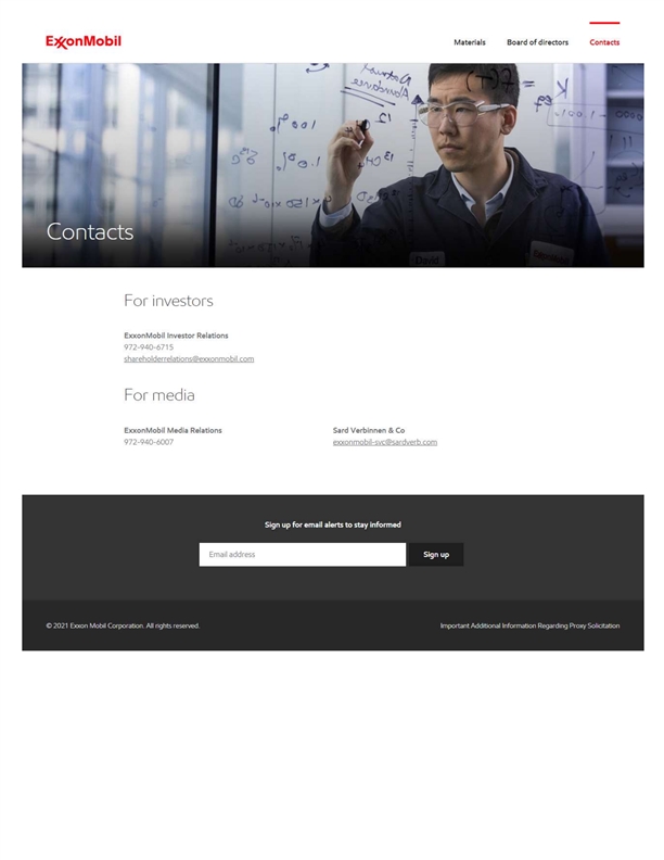Exxon Mobil Corporation (ExxonMobil) has filed a preliminary proxy statement and form of associated BLUE proxy card with the U.S. Securities and Exchange Commission (the SEC) in connection with the solicitation of proxies for ExxonMobils 2021 Annual Meeting (the Preliminary Proxy Statement). ExxonMobil, its directors and certain of its executive officers will be participants in the solicitation of proxies from shareholders in respect of the 2021 Annual Meeting. Information regarding the names of ExxonMobils directors and executive officers and their respective interests in ExxonMobil by security holdings or otherwise is set forth in the Preliminary Proxy Statement. To the extent holdings of such participants in ExxonMobils securities are not reported, or have changed since the amounts described, in the Preliminary Proxy Statement, such changes have been reflected on Initial Statements of Beneficial Ownership on Form 3 or Statements of Change in Ownership on Form 4 filed with the SEC. Details concerning the nominees of ExxonMobils Board of Directors for election at the 2021 Annual Meeting are included in the Preliminary Proxy Statement. BEFORE MAKING ANY VOTING DECISION, INVESTORS AND SHAREHOLDERS OF THE COMPANY ARE URGED TO READ ALL RELEVANT DOCUMENTS FILED WITH OR FURNISHED TO THE SEC, INCLUDING THE COMPANYS DEFINITIVE PROXY STATEMENT AND ANY SUPPLEMENTS THERETO AND ACCOMPANYING BLUE PROXY CARD WHEN THEY BECOME AVAILABLE, BECAUSE THEY WILL CONTAIN IMPORTANT INFORMATION. Investors and shareholders will be able to obtain a copy of the definitive proxy statement and other relevant documents filed by ExxonMobil free of charge from the SECs website, www.sec.gov. ExxonMobils shareholders will also be able to obtain, without charge, a copy of the definitive proxy statement and other relevant filed documents by directing a request by mail to ExxonMobil Shareholder Services at 5959 Las Colinas Boulevard, Irving, Texas, 75039-2298 or at shareholderrelations@exxonmobil.com or from the investor relations section of ExxonMobils website, www.exxonmobil.com/investor.