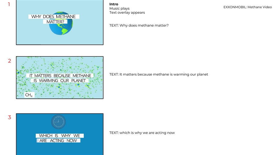 Intro 1 EXXONMOBIL: Methane Video Music plays Text overlay appears TEXT: Why does methane matter? 2 TEXT: It matters because methane is warming our planet 3 TEXT: which is why we are acting nowIntro 1 EXXONMOBIL: Methane Video Music plays Text overlay appears TEXT: Why does methane matter? 2 TEXT: It matters because methane is warming our planet 3 TEXT: which is why we are acting now