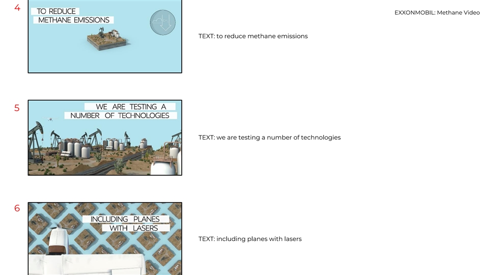 4 EXXONMOBIL: Methane Video TEXT: to reduce methane emissions 5 TEXT: we are testing a number of technologies 6 TEXT: including planes with lasers4 EXXONMOBIL: Methane Video TEXT: to reduce methane emissions 5 TEXT: we are testing a number of technologies 6 TEXT: including planes with lasers