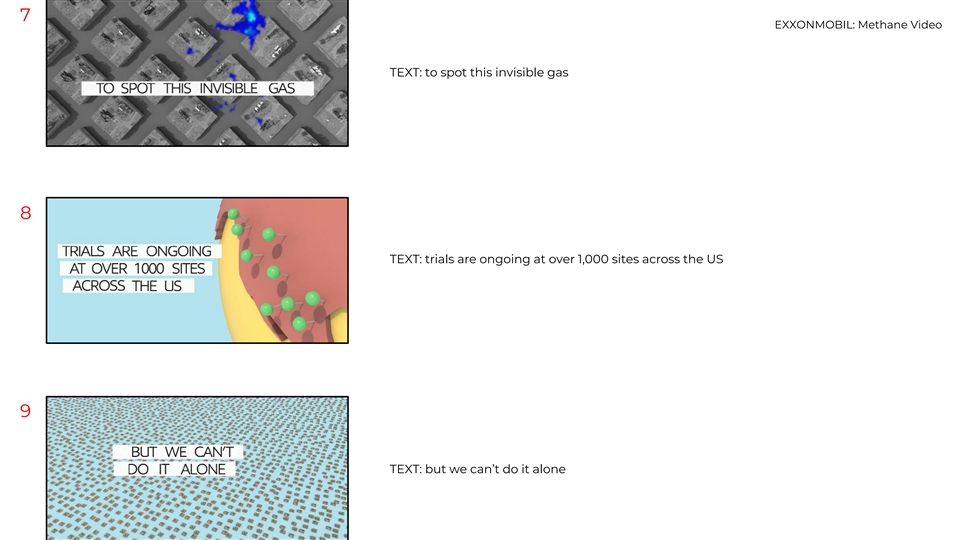 7 EXXONMOBIL: Methane Video TEXT: to spot this invisible gas 8 TEXT: trials are ongoing at over 1,000 sites across the US 9 TEXT: but we can’t do it alone7 EXXONMOBIL: Methane Video TEXT: to spot this invisible gas 8 TEXT: trials are ongoing at over 1,000 sites across the US 9 TEXT: but we can’t do it alone