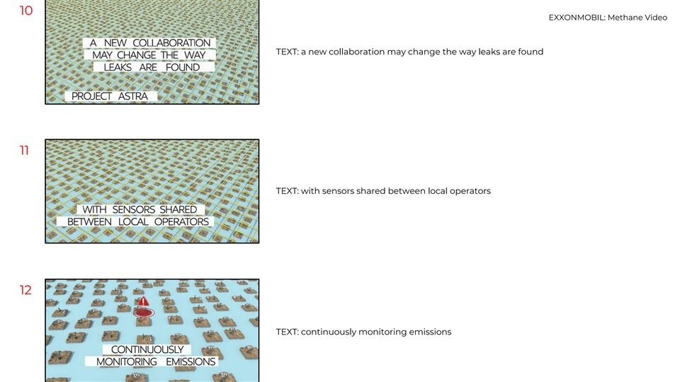 10 EXXONMOBIL: Methane Video TEXT: a new collaboration may change the way leaks are found 11 TEXT: with sensors shared between local operators 12 TEXT: continuously monitoring emissions 10 EXXONMOBIL: Methane Video TEXT: a new collaboration may change the way leaks are found 11 TEXT: with sensors shared between local operators 12 TEXT: continuously monitoring emissions