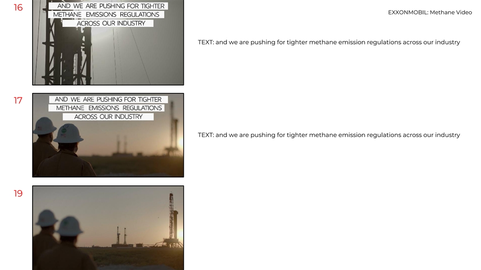 16 EXXONMOBIL: Methane Video TEXT: and we are pushing for tighter methane emission regulations across our industry 17 TEXT: and we are pushing for tighter methane emission regulations across our industry 1916 EXXONMOBIL: Methane Video TEXT: and we are pushing for tighter methane emission regulations across our industry 17 TEXT: and we are pushing for tighter methane emission regulations across our industry 19