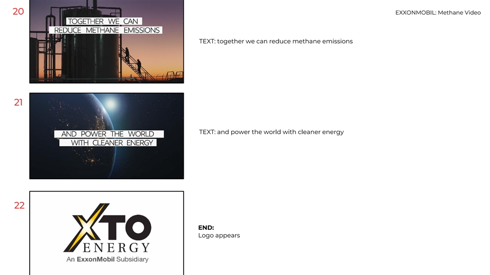 20 EXXONMOBIL: Methane Video TEXT: together we can reduce methane emissions 21 TEXT: and power the world with cleaner energy 22 END: Logo appears 20 EXXONMOBIL: Methane Video TEXT: together we can reduce methane emissions 21 TEXT: and power the world with cleaner energy 22 END: Logo appears