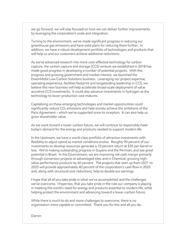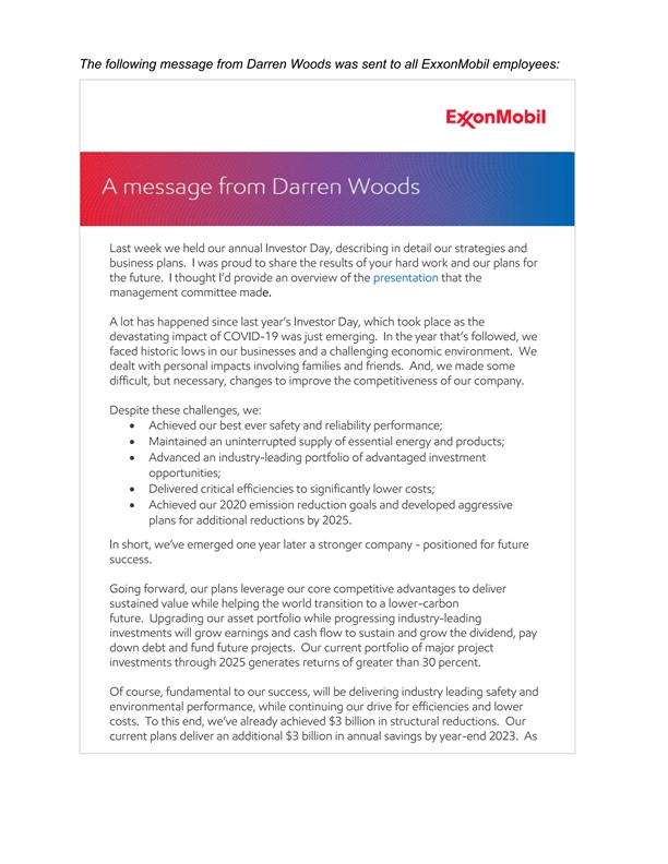 The following message from Darren Woods was sent to all ExxonMobil employees: Last week we held our annual Investor Day, describing in detail our strategies and business plans. I was proud to share the results of your hard work and our plans for the future. I thought I’d provide an overview of the presentation that the management committee made. A lot has happened since last year’s Investor Day, which took place as the devastating impact of COVID-19 was just emerging. In the year that’s followed, we faced historic lows in our businesses and a challenging economic environment. We dealt with personal impacts involving families and friends. And, we made some difficult, but necessary, changes to improve the competitiveness of our company. Despite these challenges, we: · Achieved our best ever safety and reliability performance; · Maintained an uninterrupted supply of essential energy and products; · Advanced an industry-leading portfolio of advantaged investment opportunities; · Delivered critical efficiencies to significantly lower costs; · Achieved our 2020 emission reduction goals and developed aggressive plans for additional reductions by 2025. In short, we’ve emerged one year later a stronger company - positioned for future success. Going forward, our plans leverage our core competitive advantages to deliver sustained value while helping the world transition to a lower-carbon future. Upgrading our asset portfolio while progressing industry-leading investments will grow earnings and cash flow to sustain and grow the dividend, pay down debt and fund future projects. Our current portfolio of major project investments through 2025 generates returns of greater than 30 percent. Of course, fundamental to our success, will be delivering industry leading safety and environmental performance, while continuing our drive for efficiencies and lower costs. To this end, we’ve already achieved $3 billion in structural reductions. Our current plans deliver an additional $3 billion in annual savings by year-end 2023. As The following message from Darren Woods was sent to all ExxonMobil employees: Last week we held our annual Investor Day, describing in detail our strategies and business plans. I was proud to share the results of your hard work and our plans for the future. I thought I’d provide an overview of the presentation that the management committee made. A lot has happened since last year’s Investor Day, which took place as the devastating impact of COVID-19 was just emerging. In the year that’s followed, we faced historic lows in our businesses and a challenging economic environment. We dealt with personal impacts involving families and friends. And, we made some difficult, but necessary, changes to improve the competitiveness of our company. Despite these challenges, we: · Achieved our best ever safety and reliability performance; · Maintained an uninterrupted supply of essential energy and products; · Advanced an industry-leading portfolio of advantaged investment opportunities; · Delivered critical efficiencies to significantly lower costs; · Achieved our 2020 emission reduction goals and developed aggressive plans for additional reductions by 2025. In short, we’ve emerged one year later a stronger company - positioned for future success. Going forward, our plans leverage our core competitive advantages to deliver sustained value while helping the world transition to a lower-carbon future. Upgrading our asset portfolio while progressing industry-leading investments will grow earnings and cash flow to sustain and grow the dividend, pay down debt and fund future projects. Our current portfolio of major project investments through 2025 generates returns of greater than 30 percent. Of course, fundamental to our success, will be delivering industry leading safety and environmental performance, while continuing our drive for efficiencies and lower costs. To this end, we’ve already achieved $3 billion in structural reductions. Our current plans deliver an additional $3 billion in annual savings by year-end 2023. As