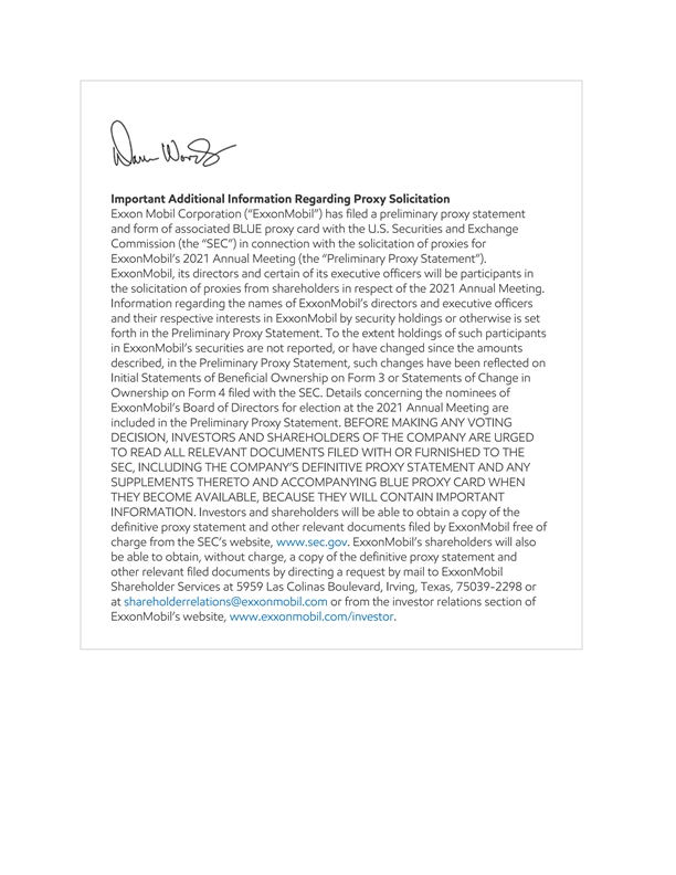 Important Additional Information Regarding Proxy Solicitation Exxon Mobil Corporation (“ExxonMobil”) has filed a preliminary proxy statement and form of associated BLUE proxy card with the U.S. Securities and Exchange Commission (the “SEC”) in connection with the solicitation of proxies for ExxonMobil’s 2021 Annual Meeting (the “Preliminary Proxy Statement”). ExxonMobil, its directors and certain of its executive officers will be participants in the solicitation of proxies from shareholders in respect of the 2021 Annual Meeting. Information regarding the names of ExxonMobil’s directors and executive officers and their respective interests in ExxonMobil by security holdings or otherwise is set forth in the Preliminary Proxy Statement. To the extent holdings of such participants in ExxonMobil’s securities are not reported, or have changed since the amounts described, in the Preliminary Proxy Statement, such changes have been reflected on Initial Statements of Beneficial Ownership on Form 3 or Statements of Change in Ownership on Form 4 filed with the SEC. Details concerning the nominees of ExxonMobil’s Board of Directors for election at the 2021 Annual Meeting are included in the Preliminary Proxy Statement. BEFORE MAKING ANY VOTING DECISION, INVESTORS AND SHAREHOLDERS OF THE COMPANY ARE URGED TO READ ALL RELEVANT DOCUMENTS FILED WITH OR FURNISHED TO THE SEC, INCLUDING THE COMPANY’S DEFINITIVE PROXY STATEMENT AND ANY SUPPLEMENTS THERETO AND ACCOMPANYING BLUE PROXY CARD WHEN THEY BECOME AVAILABLE, BECAUSE THEY WILL CONTAIN IMPORTANT INFORMATION. Investors and shareholders will be able to obtain a copy of the definitive proxy statement and other relevant documents filed by ExxonMobil free of charge from the SEC’s website, www.sec.gov. ExxonMobil’s shareholders will also be able to obtain, without charge, a copy of the definitive proxy statement and other relevant filed documents by directing a request by mail to ExxonMobil Shareholder Services at 5959 Las Colinas Boulevard, Irving, Texas, 75039-2298 or at shareholderrelations@exxonmobil.com or from the investor relations section of ExxonMobil’s website, www.exxonmobil.com/investor. Important Additional Information Regarding Proxy Solicitation Exxon Mobil Corporation (“ExxonMobil”) has filed a preliminary proxy statement and form of associated BLUE proxy card with the U.S. Securities and Exchange Commission (the “SEC”) in connection with the solicitation of proxies for ExxonMobil’s 2021 Annual Meeting (the “Preliminary Proxy Statement”). ExxonMobil, its directors and certain of its executive officers will be participants in the solicitation of proxies from shareholders in respect of the 2021 Annual Meeting. Information regarding the names of ExxonMobil’s directors and executive officers and their respective interests in ExxonMobil by security holdings or otherwise is set forth in the Preliminary Proxy Statement. To the extent holdings of such participants in ExxonMobil’s securities are not reported, or have changed since the amounts described, in the Preliminary Proxy Statement, such changes have been reflected on Initial Statements of Beneficial Ownership on Form 3 or Statements of Change in Ownership on Form 4 filed with the SEC. Details concerning the nominees of ExxonMobil’s Board of Directors for election at the 2021 Annual Meeting are included in the Preliminary Proxy Statement. BEFORE MAKING ANY VOTING DECISION, INVESTORS AND SHAREHOLDERS OF THE COMPANY ARE URGED TO READ ALL RELEVANT DOCUMENTS FILED WITH OR FURNISHED TO THE SEC, INCLUDING THE COMPANY’S DEFINITIVE PROXY STATEMENT AND ANY SUPPLEMENTS THERETO AND ACCOMPANYING BLUE PROXY CARD WHEN THEY BECOME AVAILABLE, BECAUSE THEY WILL CONTAIN IMPORTANT INFORMATION. Investors and shareholders will be able to obtain a copy of the definitive proxy statement and other relevant documents filed by ExxonMobil free of charge from the SEC’s website, www.sec.gov. ExxonMobil’s shareholders will also be able to obtain, without charge, a copy of the definitive proxy statement and other relevant filed documents by directing a request by mail to ExxonMobil Shareholder Services at 5959 Las Colinas Boulevard, Irving, Texas, 75039-2298 or at shareholderrelations@exxonmobil.com or from the investor relations section of ExxonMobil’s website, www.exxonmobil.com/investor.