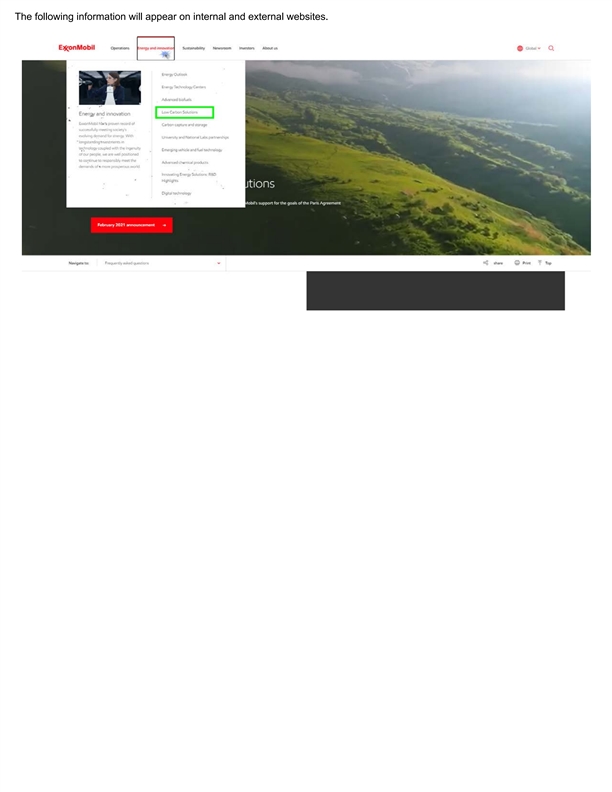Exxon Mobil Corporation (ExxonMobil) has filed a preliminary proxy statement and form of associated BLUE proxy card with the U.S. Securities and Exchange Commission (the SEC) in connection with the solicitation of proxies for ExxonMobils 2021 Annual Meeting (the Preliminary Proxy Statement). ExxonMobil, its directors and certain of its executive officers will be participants in the solicitation of proxies from shareholders in respect of the 2021 Annual Meeting. Information regarding the names of ExxonMobils directors and executive officers and their respective interests in ExxonMobil by security holdings or otherwise is set forth in the Preliminary Proxy Statement. To the extent holdings of such participants in ExxonMobils securities are not reported, or have changed since the amounts described, in the Preliminary Proxy Statement, such changes have been reflected on Initial Statements of Beneficial Ownership on Form 3 or Statements of Change in Ownership on Form 4 filed with the SEC. Details concerning the nominees of ExxonMobils Board of Directors for election at the 2021 Annual Meeting are included in the Preliminary Proxy Statement. BEFORE MAKING ANY VOTING DECISION, INVESTORS AND SHAREHOLDERS OF THE COMPANY ARE URGED TO READ ALL RELEVANT DOCUMENTS FILED WITH OR FURNISHED TO THE SEC, INCLUDING THE COMPANYS DEFINITIVE PROXY STATEMENT AND ANY SUPPLEMENTS THERETO AND ACCOMPANYING BLUE PROXY CARD WHEN THEY BECOME AVAILABLE, BECAUSE THEY WILL CONTAIN IMPORTANT INFORMATION. Investors and shareholders will be able to obtain a copy of the definitive proxy statement and other relevant documents filed by ExxonMobil free of charge from the SECs website, www.sec.gov. ExxonMobils shareholders will also be able to obtain, without charge, a copy of the definitive proxy statement and other relevant filed documents by directing a request by mail to ExxonMobil Shareholder Services at 5959 Las Colinas Boulevard, Irving, Texas, 75039-2298 or at shareholderrelations@exxonmobil.com or from the investor relations section of ExxonMobils website, www.exxonmobil.com/investor.