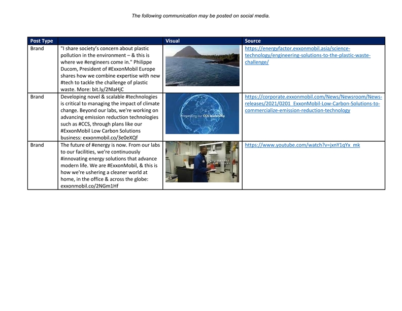 The following communication may be posted on social media. C Po op st y Type Visual Source Brand I share society’s concern about plastic https://energyfactor.exxonmobil.asia/science- pollution in the environment – & this is technology/engineering-solutions-to-the-plastic-waste- where we #engineers come in. Philippe challenge/ Ducom, President of #ExxonMobil Europe shares how we combine expertise with new #tech to tackle the challenge of plastic waste. More: bit.ly/2NlaHjC Brand Developing novel & scalable #technologies https://corporate.exxonmobil.com/News/Newsroom/News- is critical to managing the impact of climate releases/2021/0201_ExxonMobil-Low-Carbon-Solutions-to- change. Beyond our labs, we're working on commercialize-emission-reduction-technology advancing emission reduction technologies such as #CCS, through plans like our #ExxonMobil Low Carbon Solutions business: exxonmobil.co/3e0eXQf Brand The future of #energy is now. From our labs https://www.youtube.com/watch?v=jxnY1qYx_mk to our facilities, we're continuously #innovating energy solutions that advance modern life. We are #ExxonMobil, & this is how we're ushering a cleaner world at home, in the office & across the globe: exxonmobil.co/2NGm1Hf The following communication may be posted on social media. C Po op st y Type Visual Source Brand I share society’s concern about plastic https://energyfactor.exxonmobil.asia/science- pollution in the environment – & this is technology/engineering-solutions-to-the-plastic-waste- where we #engineers come in. Philippe challenge/ Ducom, President of #ExxonMobil Europe shares how we combine expertise with new #tech to tackle the challenge of plastic waste. More: bit.ly/2NlaHjC Brand Developing novel & scalable #technologies https://corporate.exxonmobil.com/News/Newsroom/News- is critical to managing the impact of climate releases/2021/0201_ExxonMobil-Low-Carbon-Solutions-to- change. Beyond our labs, we're working on commercialize-emission-reduction-technology advancing emission reduction technologies such as #CCS, through plans like our #ExxonMobil Low Carbon Solutions business: exxonmobil.co/3e0eXQf Brand The future of #energy is now. From our labs https://www.youtube.com/watch?v=jxnY1qYx_mk to our facilities, we're continuously #innovating energy solutions that advance modern life. We are #ExxonMobil, & this is how we're ushering a cleaner world at home, in the office & across the globe: exxonmobil.co/2NGm1Hf