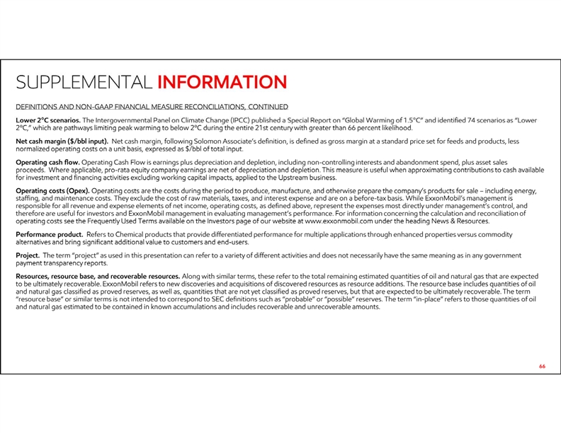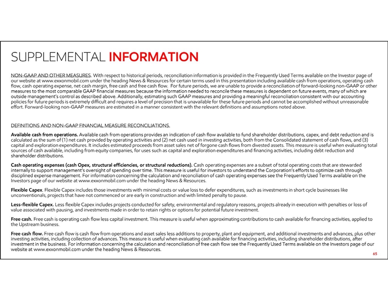 • 65 NON-GAAP AND OTHER MEASURES. With respect to historical periods, reconciliation information is provided in the Frequently Used Terms available on the Investor page of our website at www.exxonmobil.com under the heading News & Resources for certain terms used inthis presentation including available cash from operations, operating cash flow, cash operating expense, net cash margin, free cash and free cash flow. For future periods, we are unable to provide a reconciliation of forward-looking non-GAAP or other measures to the most comparable GAAP financial measures because the information needed to reconcile these measures is dependent on future events, many of which are outside management’s control as described above. Additionally, estimating such GAAP measures and providing a meaningful reconciliation consistent with our accounting policies for future periods is extremely difficult and requires a level of precision that is unavailable for these future periods and cannot be accomplished without unreasonable effort. Forward-looking non-GAAP measures are estimated in a manner consistent with the relevant definitions and assumptions noted above. • • DEFINITIONS AND NON-GAAP FINANCIAL MEASURE RECONCILIATIONS. • Available cash from operations. Available cash from operations provides an indication of cash flow available to fund shareholder distributions, capex, and debt reduction and is calculated as the sum of (1) net cash provided by operating activities and (2) net cash used in investing activities, both from the Consolidated statement of cash flows, and (3) capital and exploration expenditures. It includes estimated proceeds from asset sales net of forgone cash flows from divested assets. This measure is useful when evaluating total sources of cash available, including from equity companies, for uses such as capital and exploration expenditures and financing activities, including debt reduction and shareholder distributions. • Cash operating expenses (cash Opex, structural efficiencies, or structural reductions). Cash operating expenses are a subset of total operating costs that are stewarded internally to support management’s oversight of spending over time. This measure is useful for investors to understand the Corporation’s efforts to optimize cash through disciplined expense management. For information concerning the calculation and reconciliation of cash operating expenses see the Frequently Used Terms available on the Investors page of our website at www.exxonmobil.com under the heading News & Resources. • Flexible Capex. Flexible Capex includes those investments with minimal costs or value loss to defer expenditures, such as investments in short cycle businesses like unconventionals, projects that have not commenced or are early in construction and with limited penalty to pause. • Less-flexible Capex. Less flexible Capex includes projects conducted for safety, environmental and regulatory reasons, projects already in execution with penalties or loss of value associated with pausing, and investments made in order to retain rights or options for potential future investment. • Free cash. Free cash is operating cash flow less capital investment. This measure is useful when approximating contributions to cash available for financing activities, applied to the Upstream business. • Free cash flow. Free cash flow is cash flow from operations and asset sales less additions to property, plant and equipment, and additional investments and advances, plus other investing activities, including collection of advances. This measure is useful when evaluating cash available for financing activities, including shareholder distributions, after investment in the business. For information concerning the calculation and reconciliation of free cash flow see the Frequently Used Terms available on the Investors page of our website at www.exxonmobil.com under the heading News & Resources. • SUPPLEMENTAL INFORMATION • 65 NON-GAAP AND OTHER MEASURES. With respect to historical periods, reconciliation information is provided in the Frequently Used Terms available on the Investor page of our website at www.exxonmobil.com under the heading News & Resources for certain terms used inthis presentation including available cash from operations, operating cash flow, cash operating expense, net cash margin, free cash and free cash flow. For future periods, we are unable to provide a reconciliation of forward-looking non-GAAP or other measures to the most comparable GAAP financial measures because the information needed to reconcile these measures is dependent on future events, many of which are outside management’s control as described above. Additionally, estimating such GAAP measures and providing a meaningful reconciliation consistent with our accounting policies for future periods is extremely difficult and requires a level of precision that is unavailable for these future periods and cannot be accomplished without unreasonable effort. Forward-looking non-GAAP measures are estimated in a manner consistent with the relevant definitions and assumptions noted above. • • DEFINITIONS AND NON-GAAP FINANCIAL MEASURE RECONCILIATIONS. • Available cash from operations. Available cash from operations provides an indication of cash flow available to fund shareholder distributions, capex, and debt reduction and is calculated as the sum of (1) net cash provided by operating activities and (2) net cash used in investing activities, both from the Consolidated statement of cash flows, and (3) capital and exploration expenditures. It includes estimated proceeds from asset sales net of forgone cash flows from divested assets. This measure is useful when evaluating total sources of cash available, including from equity companies, for uses such as capital and exploration expenditures and financing activities, including debt reduction and shareholder distributions. • Cash operating expenses (cash Op