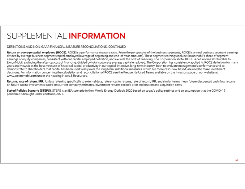 SUPPLEMENTAL INFORMATION • 67 SUPPLEMENTAL INFORMATION DEFINITIONS AND NON-GAAP FINANCIAL MEASURE RECONCILIATIONS, CONTINUED • Return on average capital employed (ROCE). ROCE is a performance measure ratio. From the perspective of the business segments, ROCE is annual business segment earnings divided by average business segment capital employed (average of beginning and end-of-year amounts). These segment earnings include ExxonMobil’s share of segment earnings of equity companies, consistent with our capital employed definition, and exclude the cost of financing. The Corporation’s total ROCE is net income attributable to ExxonMobil, excluding the after-tax cost of financing, divided by total corporate average capital employed. The Corporation has consistently applied its ROCE definition for many years and views it as the best measure of historical capital productivity in our capital-intensive, long-term industry, both to evaluate management’s performance and to demonstrate to shareholders that capital has been used wisely over the long term. Additional measures, which are more cash-flow based, are used to make investment decisions. For information concerning the calculation and reconciliation of ROCE see the Frequently Used Terms available on the Investors page of our website at www.exxonmobil.com under the heading News & Resources. • Returns, rate of return, IRR. Unless referring specifically to external data, references to returns, rate of return, IRR, and similar terms mean future discounted cash flow returns on future capital investments based on current company estimates. Investment returns exclude prior exploration and acquisition costs. • Stated Policies Scenario (STEPS). STEPS is an IEA scenario in their World Energy Outlook 2020 based on today’s policy settings and an assumption that the COVID-19 pandemic is brought under control in 2021. SUPPLEMENTAL INFORMATION • 67 SUPPLEMENTAL INFORMATION DEFINITIONS AND NON-GAAP FINANCIAL MEASURE RECONCILIATIONS, CONTINUED • Return on average capital employed (ROCE). ROCE is a performance measure ratio. From the perspective of the business segments, ROCE is annual business segment earnings divided by average business segment capital employed (average of beginning and end-of-year amounts). These segment earnings include ExxonMobil’s share of segment earnings of equity companies, consistent with our capital employed definition, and exclude the cost of financing. The Corporation’s total ROCE is net income attributable to ExxonMobil, excluding the after-tax cost of financing, divided by total corporate average capital employed. The Corporation has consistently applied its ROCE definition for many years and views it as the best measure of historical capital productivity in our capital-intensive, long-term industry, both to evaluate management’s performance and to demonstrate to shareholders that capital has been used wisely over the long term. Additional measures, which are more cash-flow based, are used to make investment decisions. For information concerning the calculation and reconciliation of ROCE see the Frequently Used Terms available on the Investors page of our website at www.exxonmobil.com under the heading News & Resources. • Returns, rate of return, IRR. Unless referring specifically to external data, references to returns, rate of return, IRR, and similar terms mean future discounted cash flow returns on future capital investments based on current company estimates. Investment returns exclude prior exploration and acquisition costs. • Stated Policies Scenario (STEPS). STEPS is an IEA scenario in their World Energy Outlook 2020 based on today’s policy settings and an assumption that the COVID-19 pandemic is brought under control in 2021.