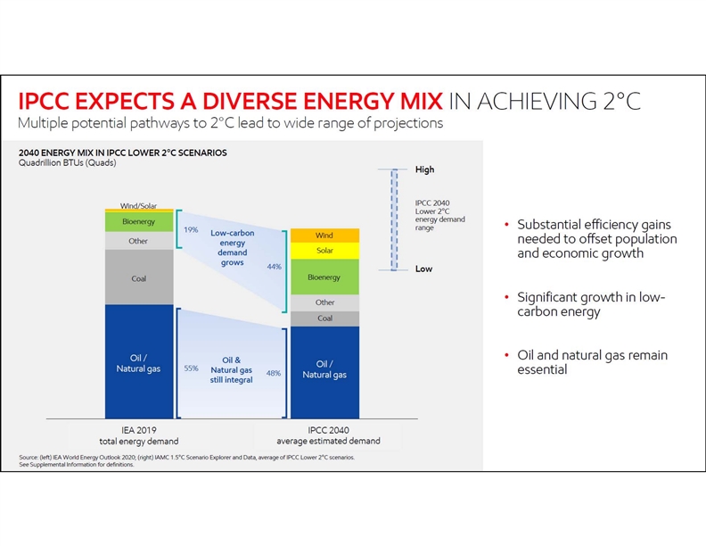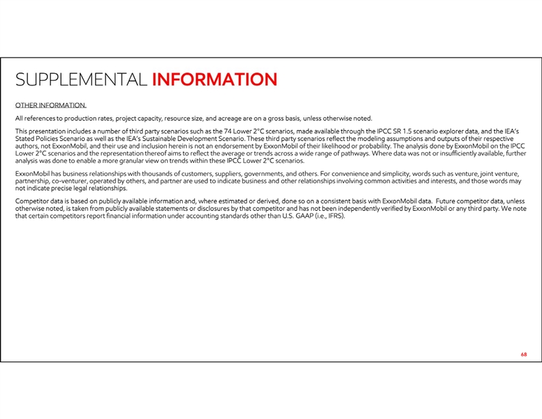 • 68 OTHER INFORMATION. • All references to production rates, project capacity, resource size, and acreage are on a gross basis, unless otherwise noted. • This presentation includes a number of third party scenarios such as the 74 Lower 2°C scenarios, made available through the IPCC SR 1.5 scenario explorer data, and the IEA’s Stated Policies Scenario as well as the IEA’s Sustainable Development Scenario. These third party scenarios reflect the modeling assumptions and outputs of their respective authors, not ExxonMobil, and their use and inclusion herein is not an endorsement by ExxonMobil of their likelihood or probability. The analysis done by ExxonMobil on the IPCC Lower 2°C scenarios and the representation thereof aims to reflect the average or trends across a wide range of pathways. Where data was not or insufficiently available, further analysis was done to enable a more granular view on trends within these IPCC Lower 2°C scenarios. • ExxonMobil has business relationships with thousands of customers, suppliers, governments, and others. For convenience and simplicity, words such as venture, joint venture, partnership, co-venturer, operated by others, and partner are used to indicate business and other relationships involving common activities and interests, and those words may not indicate precise legal relationships. • Competitor data is based on publicly available information and, where estimated or derived, done so on a consistent basis with ExxonMobil data. Future competitor data, unless otherwise noted, is taken from publicly available statements or disclosures by that competitor and has not been independently verified by ExxonMobil or any third party. We note that certain competitors report financial information under accounting standards other than U.S. GAAP (i.e., IFRS). SUPPLEMENTAL INFORMATION • 68 OTHER INFORMATION. • All references to production rates, project capacity, resource size, and acreage are on a gross basis, unless otherwise noted. • This presentation includes a number of third party scenarios such as the 74 Lower 2°C scenarios, made available through the IPCC SR 1.5 scenario explorer data, and the IEA’s Stated Policies Scenario as well as the IEA’s Sustainable Development Scenario. These third party scenarios reflect the modeling assumptions and outputs of their respective authors, not ExxonMobil, and their use and inclusion herein is not an endorsement by ExxonMobil of their likelihood or probability. The analysis done by ExxonMobil on the IPCC Lower 2°C scenarios and the representation thereof aims to reflect the average or trends across a wide range of pathways. Where data was not or insufficiently available, further analysis was done to enable a more granular view on trends within these IPCC Lower 2°C scenarios. • ExxonMobil has business relationships with thousands of customers, suppliers, governments, and others. For convenience and simplicity, words such as venture, joint venture, partnership, co-venturer, operated by others, and partner are used to indicate business and other relationships involving common activities and interests, and those words may not indicate precise legal relationships. • Competitor data is based on publicly available information and, where estimated or derived, done so on a consistent basis with ExxonMobil data. Future competitor data, unless otherwise noted, is taken from publicly available statements or disclosures by that competitor and has not been independently verified by ExxonMobil or any third party. We note that certain competitors report financial information under accounting standards other than U.S. GAAP (i.e., IFRS). SUPPLEMENTAL INFORMATION