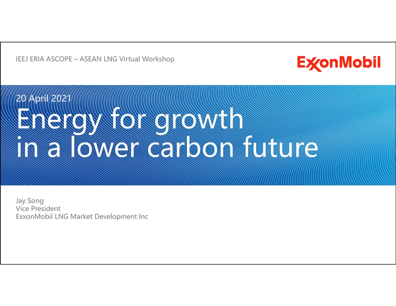 IEEJ ERIA ASCOPE – ASEAN LNG Virtual Workshop 20 April 2021 Energy for growth in a lower carbon future Jay Song Vice President ExxonMobil LNG Market Development IncIEEJ ERIA ASCOPE – ASEAN LNG Virtual Workshop 20 April 2021 Energy for growth in a lower carbon future Jay Song Vice President ExxonMobil LNG Market Development Inc