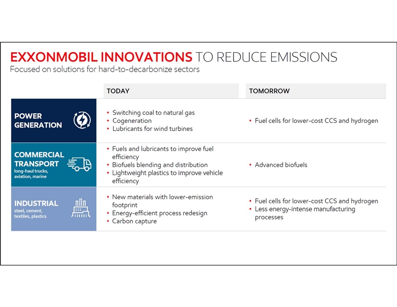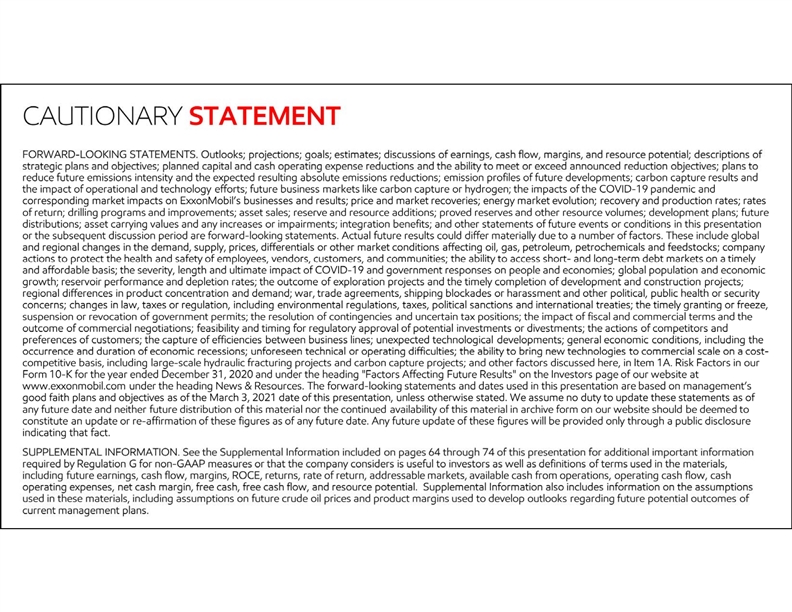 CAUTIONARY STATEMENT • 2 CAUTIONARY STATEMENT FORWARD-LOOKING STATEMENTS. Outlooks; projections; goals; estimates; discussions of earnings, cash flow, margins, and resource potential; descriptions of strategic plans and objectives; planned capital and cash operating expense reductions and the ability to meet or exceed announced reduction objectives; plans to reduce future emissions intensity and the expected resulting absolute emissions reductions; emission profiles of future developments; carbon capture results and the impact of operational and technology efforts; future business markets like carbon capture or hydrogen; the impacts of the COVID-19 pandemic and corresponding market impacts on ExxonMobil’s businesses and results; price and market recoveries; energy market evolution; recovery and production rates; rates of return; drilling programs and improvements; asset sales; reserve and resource additions; proved reserves and other resource volumes; development plans; future distributions; asset carrying values and any increases or impairments; integration benefits; and other statements of future events or conditions in this presentation or the subsequent discussion period are forward-looking statements. Actual future results could differ materially due to a number of factors. These include global and regional changes in the demand, supply, prices, differentials or other market conditions affecting oil, gas, petroleum, petrochemicals and feedstocks; company actions to protect the health and safety of employees, vendors, customers, and communities; the ability to access short- and long-term debt markets on a timely and affordable basis; the severity, length and ultimate impact of COVID-19 and government responses on people and economies; global population and economic growth; reservoir performance and depletion rates; the outcome of exploration projects and the timely completion of development and construction projects; regional differences in product concentration and demand; war, trade agreements, shipping blockades or harassment and other political, public health or security concerns; changes in law, taxes or regulation, including environmental regulations, taxes, political sanctions and international treaties; the timely granting or freeze, suspension or revocation of government permits; the resolution of contingencies and uncertain tax positions; the impact of fiscal and commercial terms and the outcome of commercial negotiations; feasibility and timing for regulatory approval of potential investments or divestments; the actions of competitors and preferences of customers; the capture of efficiencies between business lines; unexpected technological developments; general economic conditions, including the occurrence and duration of economic recessions; unforeseen technical or operating difficulties; the ability to bring new technologies to commercial scale on a cost-competitive basis, including large-scale hydraulic fracturing projects and carbon capture projects; and other factors discussed here, in Item 1A. Risk Factors in our Form 10-K for the year ended December 31, 2020 and under the heading Factors Affecting Future Results on the Investors page of our website at www.exxonmobil.com under the heading News & Resources. The forward-looking statements and dates used in this presentation are based on management’s good faith plans and objectives as of the March 3, 2021 date of this presentation, unless otherwise stated. We assume no duty to update these statements as of any future date and neither future distribution of this material nor the continued availability of this material in archive form on our website should be deemed to constitute an update or re-affirmation of these figures as of any future date. Any future update of these figures will be provided only through a public disclosure indicating that fact. • SUPPLEMENTAL INFORMATION. See the Supplemental Information included on pages 64 through 74 of this presentation for additional important information required by Regulation G for non-GAAP measures or that the company considers is useful to investors as well as definitions of terms used in the materials, including future earnings, cash flow, margins, ROCE, returns, rate of return, addressable markets, available cash from operations, operating cash flow, cash operating expenses, net cash margin, free cash, free cash flow, and resource potential. Supplemental Information also includes information on the assumptions used in these materials, including assumptions on future crude oil prices and product margins used to develop outlooks regarding future potential outcomes of current management plans. CAUTIONARY STATEMENT • 2 CAUTIONARY STATEMENT FORWARD-LOOKING STATEMENTS. Outlooks; projections; goals; estimates; discussions of earnings, cash flow, margins, and resource potential; descriptions of strategic plans and objectives; planned capital and cash operating expense reductions and the ability to meet or exceed announced reduction objectives; plans to reduce future emissions intensity and the expected resulting absolute emissions reductions; emission profiles of future developments; carbon capture results and the impact of operational and technology efforts; future business markets like carbon capture or hydrogen; the impacts of the COVID-19 pandemic and corresponding market impacts on ExxonMobil’s businesses and results; price and market recoveries; energy market evolution; recovery and production rates; rates of return; drilling programs and improvements; asset sales; reserve and resource additions; proved reserves and other resource volumes; development plans; future distributions; asset carrying values and any increases or impairments; integration benefits; and other statements of future events or conditions in this presentation or the subsequent discussion period are forward-looking statements. Actual future results could differ materially due to a number of fac