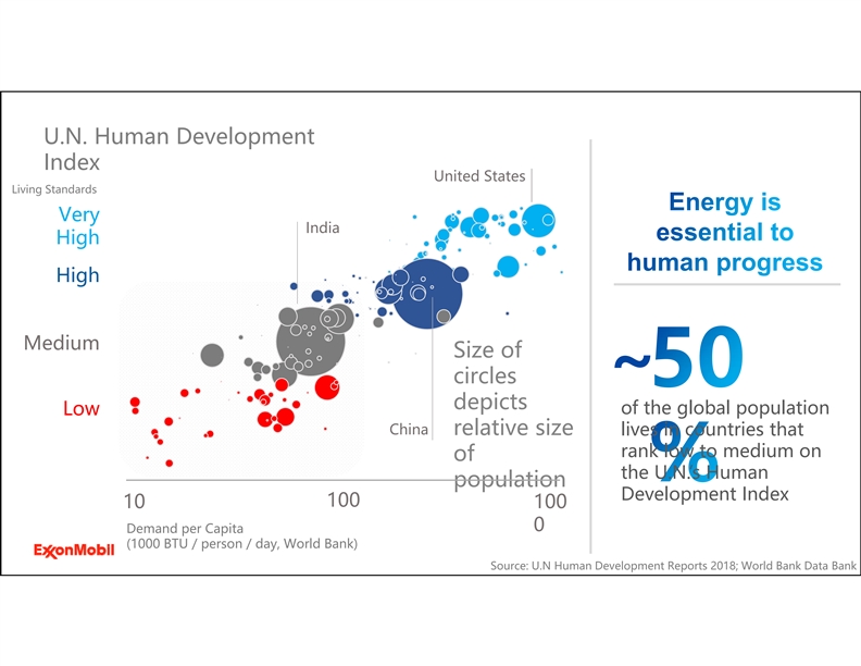 U.N. Human Development Index United States Living Standards Very India High High Medium Size of ~ circles depicts of the global population Low China relative size lives in countries that rank low to medium on of the U.N.’s Human population Development Index 100 10 100 0 Demand per Capita (1000 BTU / person / day, World Bank) Source: U.N Human Development Reports 2018; World Bank Data Bank 2U.N. Human Development Index United States Living Standards Very India High High Medium Size of ~ circles depicts of the global population Low China relative size lives in countries that rank low to medium on of the U.N.’s Human population Development Index 100 10 100 0 Demand per Capita (1000 BTU / person / day, World Bank) Source: U.N Human Development Reports 2018; World Bank Data Bank 2