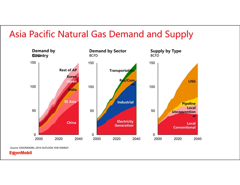 Asia Pacific Natural Gas Demand and Supply Demand by Demand by Sector Supply by Type BCFD BCFD BCFD Country 150 150150 Rest of AP Transportation Korea Res/Com Japan LNG m 100 100100 India SE Asia Industrial Pipeline Local 505050 Unconvention al Electricity China Local Generation Conventional 000 200020202040200020202040200020202040 Source: EXXONMOBIL 2019 OUTLOOK FOR ENERGYAsia Pacific Natural Gas Demand and Supply Demand by Demand by Sector Supply by Type BCFD BCFD BCFD Country 150 150150 Rest of AP Transportation Korea Res/Com Japan LNG m 100 100100 India SE Asia Industrial Pipeline Local 505050 Unconvention al Electricity China Local Generation Conventional 000 200020202040200020202040200020202040 Source: EXXONMOBIL 2019 OUTLOOK FOR ENERGY