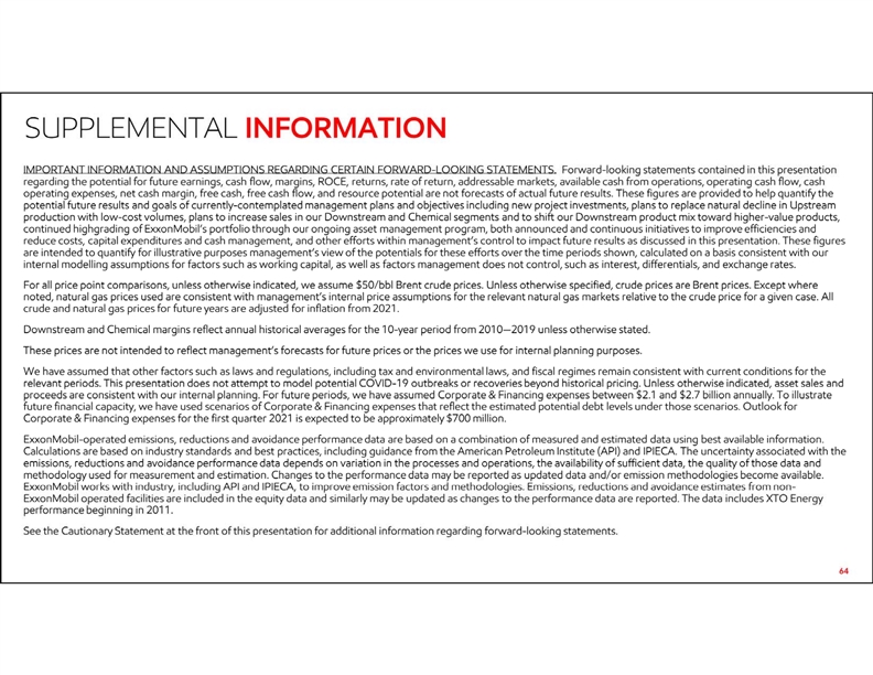 • 64 IMPORTANT INFORMATION AND ASSUMPTIONS REGARDING CERTAIN FORWARD-LOOKING STATEMENTS. Forward-looking statements contained in this presentation regarding the potential for future earnings, cash flow, margins, ROCE, returns, rate of return, addressable markets, available cash from operations, operating cash flow, cash operating expenses, net cash margin, free cash, free cash flow, and resource potential are not forecasts of actual future results. These figures are provided to help quantify the potential future results and goals of currently-contemplated management plans and objectives including new project investments, plans to replace natural decline in Upstream production with low-cost volumes, plans to increase sales in our Downstream and Chemical segments and to shift our Downstream product mix toward higher-value products, continued highgrading of ExxonMobil’s portfolio through our ongoing asset management program, both announced and continuous initiatives to improve efficiencies and reduce costs, capital expenditures and cash management, and other efforts within management’s control to impact future results as discussed in this presentation. These figures are intended to quantify for illustrative purposes management’s view of the potentials for these efforts over the time periods shown, calculated on a basis consistent with our internal modelling assumptions for factors such as working capital, as well as factors management does not control, such as interest, differentials, and exchange rates. • For all price point comparisons, unless otherwise indicated, we assume $50/bbl Brent crude prices. Unless otherwise specified, crude prices are Brent prices. Except where noted, natural gas prices used are consistent with management’s internal price assumptions for the relevant natural gas markets relative to the crude price for a given case. All crude and natural gas prices for future years are adjusted for inflation from 2021. • Downstream and Chemical margins reflect annual historical averages for the 10-year period from 2010—2019 unless otherwise stated. • These prices are not intended to reflect management’s forecasts for future prices or the prices we use for internal planning purposes. • We have assumed that other factors such as laws and regulations, including tax and environmental laws, and fiscal regimes remain consistent with current conditions for the relevant periods. This presentation does not attempt to model potential COVID-19 outbreaks or recoveries beyond historical pricing. Unless otherwise indicated, asset sales and proceeds are consistent with our internal planning. For future periods, we have assumed Corporate & Financing expenses between $2.1 and $2.7 billion annually. To illustrate future financial capacity, we have used scenarios of Corporate & Financing expenses that reflect the estimated potential debt levels under those scenarios. Outlook for Corporate & Financing expenses for the first quarter 2021 is expected to be approximately $700 million. • ExxonMobil-operated emissions, reductions and avoidance performance data are based on a combination of measured and estimated data using best available information. Calculations are based on industry standards and best practices, including guidance from the American Petroleum Institute (API) and IPIECA. The uncertainty associated with the emissions, reductions and avoidance performance data depends on variation in the processes and operations, the availability of sufficient data, the quality of those data and methodology used for measurement and estimation. Changes to the performance data may be reported as updated data and/or emission methodologies become available. ExxonMobil works with industry, including API and IPIECA, to improve emission factors and methodologies. Emissions, reductions and avoidance estimates from non-ExxonMobil operated facilities are included in the equity data and similarly may be updated as changes to the performance data are reported. The data includes XTO Energy performance beginning in 2011. • See the Cautionary Statement at the front of this presentation for additional information regarding forward-looking statements. SUPPLEMENTAL INFORMATION • 64 IMPORTANT INFORMATION AND ASSUMPTIONS REGARDING CERTAIN FORWARD-LOOKING STATEMENTS. Forward-looking statements contained in this presentation regarding the potential for future earnings, cash flow, margins, ROCE, returns, rate of return, addressable markets, available cash from operations, operating cash flow, cash operating expenses, net cash margin, free cash, free cash flow, and resource potential are not forecasts of actual future results. These figures are provided to help quantify the potential future results and goals of currently-contemplated management plans and objectives including new project investments, plans to replace natural decline in Upstream production with low-cost volumes, plans to increase sales in our Downstream and Chemical segments and to shift our Downstream product mix toward higher-value products, continued highgrading of ExxonMobil’s portfolio through our ongoing asset management program, both announced and continuous initiatives to improve efficiencies and reduce costs, capital expenditures and cash management, and other efforts within management’s control to impact future results as discussed in this presentation. These figures are intended to quantify for illustrative purposes management’s view of the potentials for these efforts over the time periods shown, calculated on a basis consistent with our internal modelling assumptions for factors such as working capital, as well as factors management does not control, such as interest, differentials, and exchange rates. • For all price point comparisons, unless otherwise indicated, we assume $50/bbl Brent crude prices. Unless otherwise specified, crude prices are Brent prices. Except where noted, natural gas prices used are consisten