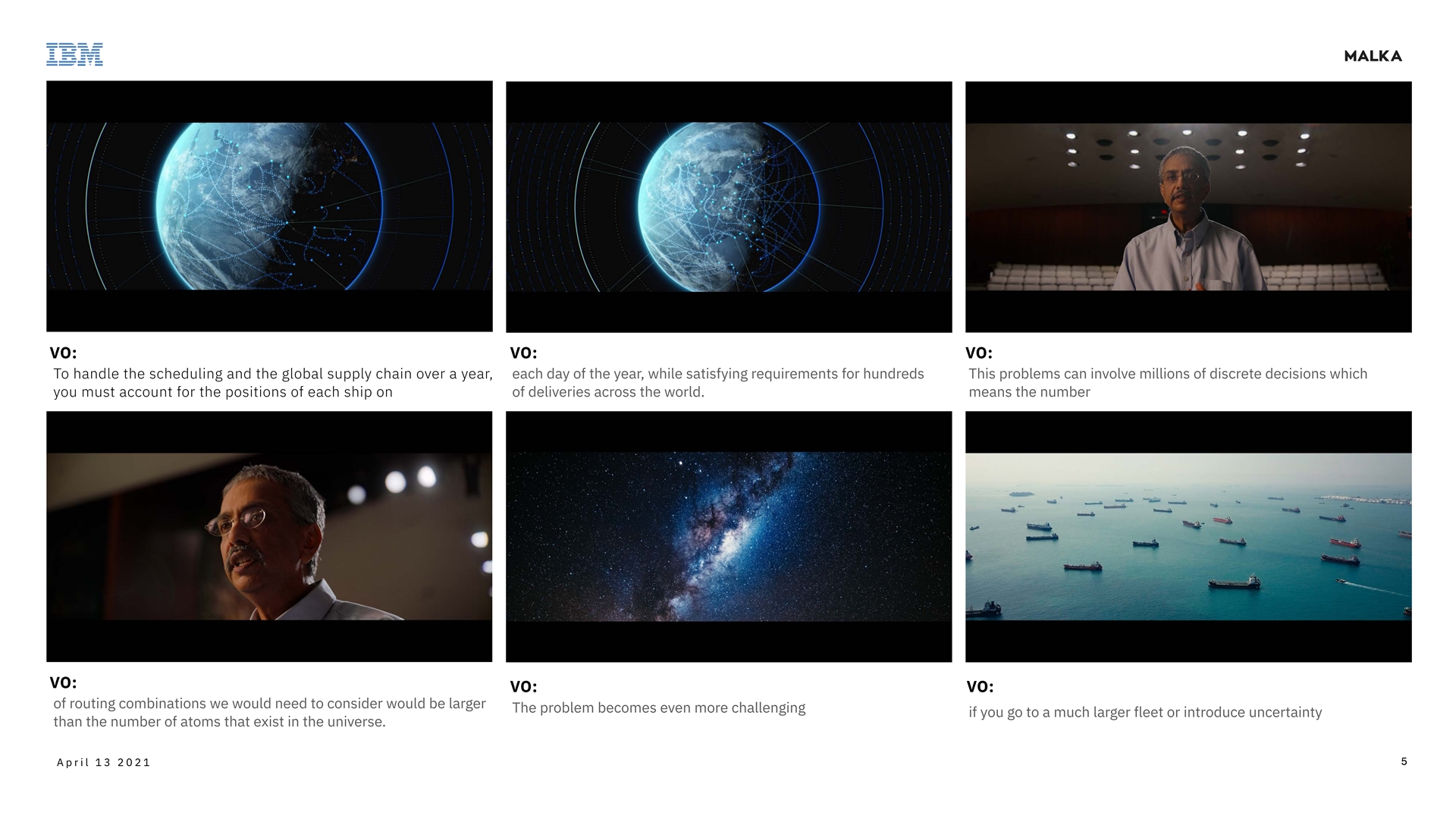 VO: VO: VO: To handle the scheduling and the global supply chain over a year, each day of the year, while satisfying requirements for hundreds This problems can involve millions of discrete decisions which you must account for the positions of each ship on of deliveries across the world. means the number VO: VO: VO: of routing combinations we would need to consider would be larger The problem becomes even more challenging if you go to a much larger fleet or introduce uncertainty than the number of atoms that exist in the universe. 5 April 13 2021VO: VO: VO: To handle the scheduling and the global supply chain over a year, each day of the year, while satisfying requirements for hundreds This problems can involve millions of discrete decisions which you must account for the positions of each ship on of deliveries across the world. means the number VO: VO: VO: of routing combinations we would need to consider would be larger The problem becomes even more challenging if you go to a much larger fleet or introduce uncertainty than the number of atoms that exist in the universe. 5 April 13 2021