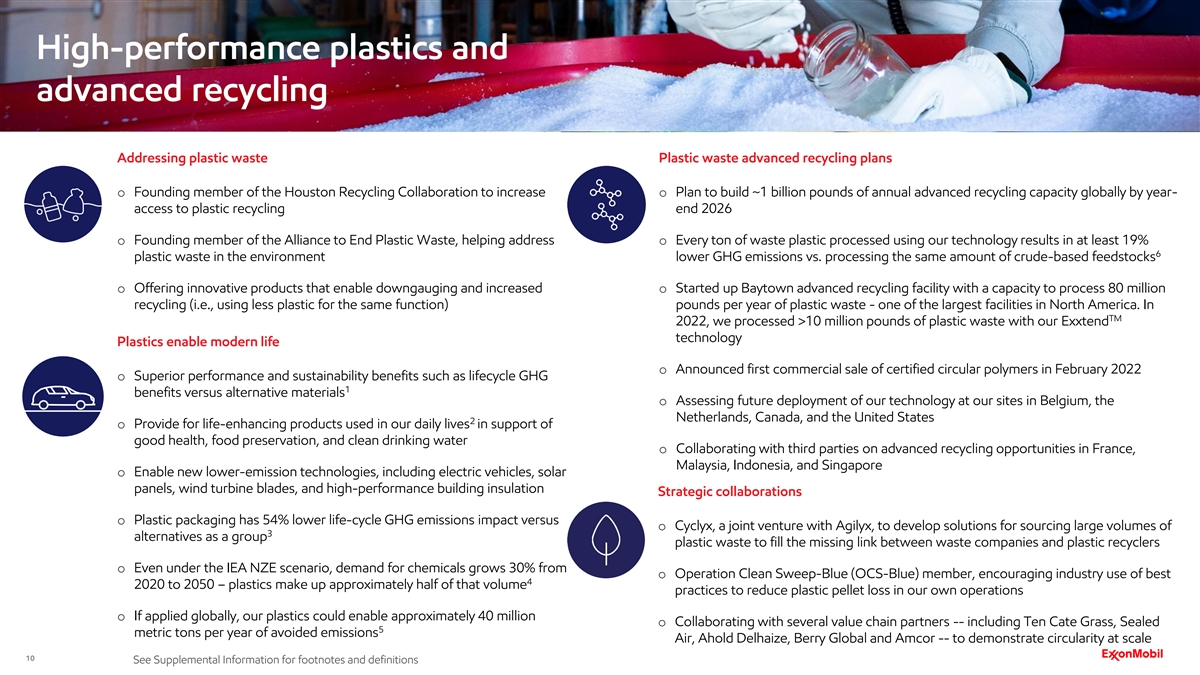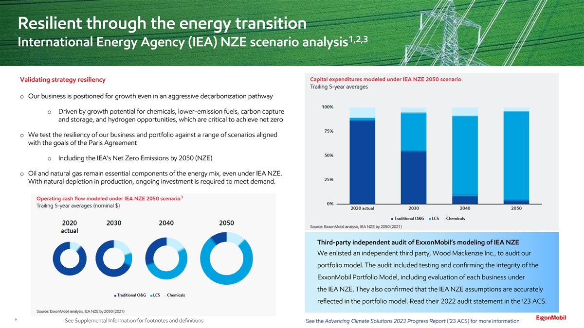 Resilient through the energy transition 1,2,3 International Energy Agency (IEA) NZE scenario analysis Validating strategy resiliency o Our business is positioned for growth even in an aggressive decarbonization pathway o Driven by growth potential for chemicals, lower-emission fuels, carbon capture and storage, and hydrogen opportunities, which are critical to achieve net zero o We test the resiliency of our business and portfolio against a range of scenarios aligned with the goals of the Paris Agreement o Including the IEA’s Net Zero Emissions by 2050 (NZE) o Oil and natural gas remain essential components of the energy mix, even under IEA NZE. With natural depletion in production, ongoing investment is required to meet demand. 3 Third-party independent audit of ExxonMobil’s modeling of IEA NZE We enlisted an independent third party, Wood Mackenzie Inc., to audit our portfolio model. The audit included testing and confirming the integrity of the ExxonMobil Portfolio Model, including evaluation of each business under the IEA NZE. They also confirmed that the IEA NZE assumptions are accurately reflected in the portfolio model. Read their 2022 audit statement in the ‘23 ACS. 9 See Supplemental Information for footnotes and definitions See the Advancing Climate Solutions 2023 Progress Report (‘23 ACS) for more information