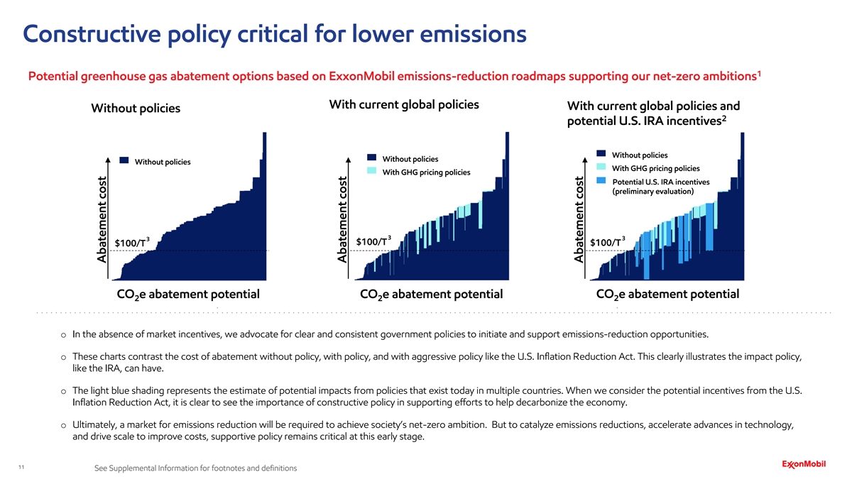 Constructive policy critical for lower emissions 1 Potential greenhouse gas abatement options based on ExxonMobil emissions-reduction roadmaps supporting our net-zero ambitions With current global policies With current global policies and Without policies 2 potential U.S. IRA incentives Without policies Without policies Without policies With GHG pricing policies With GHG pricing policies Potential U.S. IRA incentives (preliminary evaluation) 3 3 3 $100/T $100/T $100/T CO e abatement potential CO e abatement potential CO e abatement potential 2 2 2 o In the absence of market incentives, we advocate for clear and consistent government policies to initiate and support emissions-reduction opportunities. o These charts contrast the cost of abatement without policy, with policy, and with aggressive policy like the U.S. Inflation Reduction Act. This clearly illustrates the impact policy, like the IRA, can have. o The light blue shading represents the estimate of potential impacts from policies that exist today in multiple countries. When we consider the potential incentives from the U.S. Inflation Reduction Act, it is clear to see the importance of constructive policy in supporting efforts to help decarbonize the economy. o Ultimately, a market for emissions reduction will be required to achieve society’s net-zero ambition. But to catalyze emissions reductions, accelerate advances in technology, and drive scale to improve costs, supportive policy remains critical at this early stage. 11 See Supplemental Information for footnotes and definitions Abatement cost Abatement cost Abatement cost