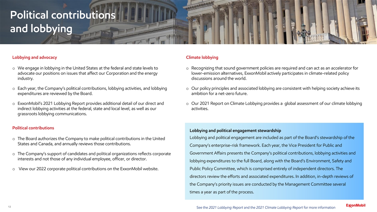 Political contributions and lobbying Lobbying and advocacy Climate lobbying o We engage in lobbying in the United States at the federal and state levels to o Recognizing that sound government policies are required and can act as an accelerator for advocate our positions on issues that affect our Corporation and the energy lower-emission alternatives, ExxonMobil actively participates in climate-related policy industry. discussions around the world. o Each year, the Company’s political contributions, lobbying activities, and lobbying o Our policy principles and associated lobbying are consistent with helping society achieve its expenditures are reviewed by the Board. ambition for a net-zero future. o ExxonMobil’s 2021 Lobbying Report provides additional detail of our direct and o Our 2021 Report on Climate Lobbying provides a global assessment of our climate lobbying indirect lobbying activities at the federal, state and local level, as well as our activities. grassroots lobbying communications. Political contributions Lobbying and political engagement stewardship Lobbying and political engagement are included as part of the Board’s stewardship of the o The Board authorizes the Company to make political contributions in the United States and Canada, and annually reviews those contributions. Company’s enterprise-risk framework. Each year, the Vice President for Public and Government Affairs presents the Company’s political contributions, lobbying activities and o The Company’s support of candidates and political organizations reflects corporate interests and not those of any individual employee, officer, or director. lobbying expenditures to the full Board, along with the Board’s Environment, Safety and Public Policy Committee, which is comprised entirely of independent directors. The o View our 2022 corporate political contributions on the ExxonMobil website. directors review the efforts and associated expenditures. In addition, in-depth reviews of the Company’s priority issues are conducted by the Management Committee several times a year as part of the process. 12 See the 2021 Lobbying Report and the 2021 Climate Lobbying Report for more information