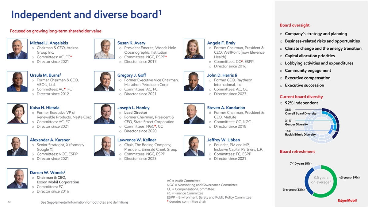 1 Independent and diverse board Board oversight Focused on growing long-term shareholder value o Company’s strategy and planning o Business-related risks and opportunities Michael J. Angelakis Susan K. Avery Angela F. Braly o Chairman & CEO, Atairos o President Emerita, Woods Hole o Former Chairman, President & o Climate change and the energy transition Group Inc. Oceanographic Institution CEO, WellPoint (now Elevance o Capital allocation priorities o Committees: AC, FC* o Committees: NGC, ESPP* Health) o Director since 2021 o Director since 2017 o Committees: CC*, ESPP o Lobbying activities and expenditures o Director since 2016 o Community engagement 2 Ursula M. Burns Gregory J. Goff John D. Harris Ii o Executive compensation o Former Chairman & CEO, o Former Executive Vice Chairman, o Former CEO, Raytheon VEON, Ltd. Marathon Petroleum Corp. International, Inc. o Executive succession o Committees: AC*, FC o Committees: AC, FC o Committees: AC, CC o Director since 2012 o Director since 2021 o Director since 2023 Current board diversity o 92% independent Kaisa H. Hietala Joseph L. Hooley Steven A. Kandarian 38% o Former Executive VP of o Lead Director o Former Chairman, President & Overall Board Diversity Renewable Products, Neste Corp. o Former Chairman, President & CEO, MetLife 31% o Committees: AC, FC CEO, State Street Corporation o Committees: CC, NGC Gender Diversity o Director since 2021 o Committees: NGC*, CC o Director since 2018 15% o Director since 2020 Racial/Ethnic Diversity Alexander A. Karsner Lawrence W. Kellner Jeffrey W. Ubben o Senior Strategist, X (formerly o Chair, The Boeing Company; o Founder, PM and MP, Google X) President, Emerald Creek Group Inclusive Capital Partners, L.P. Board refreshment o Committees: NGC, ESPP o Committees: NGC, ESPP o Committees: FC, ESPP o Director since 2021 o Director since 2023 o Director since 2021 7-10 years (8%) 3 Darren W. Woods o Chairman & CEO, <3 years (59%) 3.5 years AC = Audit Committee 1 Exxon Mobil Corporation on average NGC = Nominating and Governance Committee o Committees: FC CC = Compensation Committee 3-6 years (33%) o Director since 2016 FC = Finance Committee ESPP = Environment, Safety and Public Policy Committee 13 * denotes committee chair See Supplemental Information for footnotes and definitions