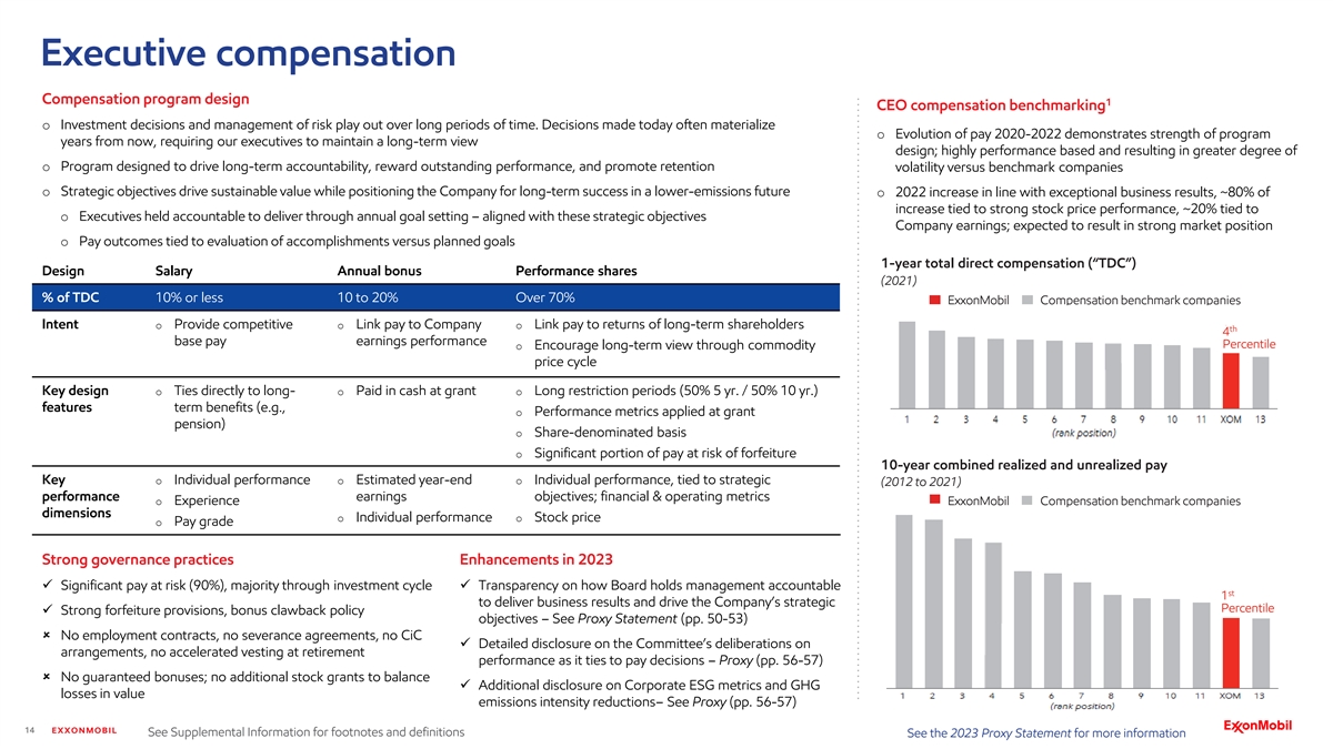 Executive compensation Compensation program design 1 CEO compensation benchmarking o Investment decisions and management of risk play out over long periods of time. Decisions made today often materialize o Evolution of pay 2020-2022 demonstrates strength of program years from now, requiring our executives to maintain a long-term view design; highly performance based and resulting in greater degree of o Program designed to drive long-term accountability, reward outstanding performance, and promote retention volatility versus benchmark companies o Strategic objectives drive sustainable value while positioning the Company for long-term success in a lower-emissions future o 2022 increase in line with exceptional business results, ~80% of increase tied to strong stock price performance, ~20% tied to o Executives held accountable to deliver through annual goal setting – aligned with these strategic objectives Company earnings; expected to result in strong market position o Pay outcomes tied to evaluation of accomplishments versus planned goals 1-year total direct compensation (“TDC”) Design Salary Annual bonus Performance shares (2021) % of TDC 10% or less 10 to 20% Over 70% ExxonMobil Compensation benchmark companies Intent o Provide competitive o Link pay to Company o Link pay to returns of long-term shareholders th 4 base pay earnings performance Percentile o Encourage long-term view through commodity price cycle Key design o Ties directly to long- o Paid in cash at grant o Long restriction periods (50% 5 yr. / 50% 10 yr.) features term benefits (e.g., o Performance metrics applied at grant pension) o Share-denominated basis o Significant portion of pay at risk of forfeiture 10-year combined realized and unrealized pay Key o Individual performance o Estimated year-end o Individual performance, tied to strategic (2012 to 2021) performance earnings objectives; financial & operating metrics o Experience ExxonMobil Compensation benchmark companies dimensions o Individual performance o Stock price o Pay grade Strong governance practices Enhancements in 2023 ✓ Significant pay at risk (90%), majority through investment cycle✓ Transparency on how Board holds management accountable st 1 to deliver business results and drive the Company’s strategic Percentile ✓ Strong forfeiture provisions, bonus clawback policy objectives – See Proxy Statement (pp. 50-53) û No employment contracts, no severance agreements, no CiC ✓ Detailed disclosure on the Committee’s deliberations on arrangements, no accelerated vesting at retirement performance as it ties to pay decisions – Proxy (pp. 56-57) û No guaranteed bonuses; no additional stock grants to balance ✓ Additional disclosure on Corporate ESG metrics and GHG losses in value emissions intensity reductions– See Proxy (pp. 56-57) 14 EXXONMOBIL See Supplemental Information for footnotes and definitions See the 2023 Proxy Statement for more information