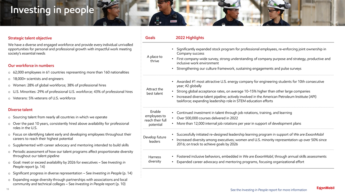 Investing in people Goals 2022 Highlights Strategic talent objective We have a diverse and engaged workforce and provide every individual unrivalled opportunities for personal and professional growth with impactful work meeting • Significantly expanded stock program for professional employees, re-enforcing joint ownership in society’s essential needs Company success A place to • First company-wide survey, strong understanding of company purpose and strategy, productive and thrive inclusive work environment Our workforce in numbers • Strengthening our culture framework, sustaining engagements and pulse surveys o 62,000 employees in 61 countries representing more than 160 nationalities o 18,000+ scientists and engineers • Awarded #1 most attractive U.S. energy company for engineering students for 10th consecutive o Women: 28% of global workforce; 38% of professional hires year; #2 globally Attract the • Strong global acceptance rates, on average 10-15% higher than other large companies o U.S. Minorities: 29% of professional U.S. workforce; 43% of professional hires best talent • Increased diverse talent pipeline; actively involved in the American Petroleum Institute (API) o Veterans: 5% veterans of U.S. workforce taskforce; expanding leadership role in STEM education efforts Diverse talent Enable • Continued investment in talent through job rotations, training, and learning employees to o Sourcing talent from nearly all countries in which we operate • Over 500,000 courses delivered in 2022 reach their full o Over the past 10 years, consistently hired above availability for professional • More than 12,000 internal job rotations per year in support of development plans potential roles in the U.S. o Focus on identifying talent early and developing employees throughout their • Successfully initiated re-designed leadership learning program in support of We are ExxonMobil Develop future careers to reach their highest potential • Increased diversity among executives; women and U.S. minority representation up over 50% since leaders 2016; on track to achieve goals by 2026 o Supplemented with career advocacy and mentoring intended to build skills o Periodic assessment of how our talent programs affect proportionate diversity throughout our talent pipeline • Fostered inclusive behaviors, embedded in We are ExxonMobil, through annual skills assessments Harness diversity • Expanded career advocacy and mentoring programs, focusing organizational effort o Goal: meet or exceed availability by 2026 for executives – See Investing in People report (p. 14) o Significant progress in diverse representation – See Investing in People (p. 14) o Expanding wage diversity through partnerships with associations and local community and technical colleges – See Investing in People report (p. 10) 15 See the Investing in People report for more information