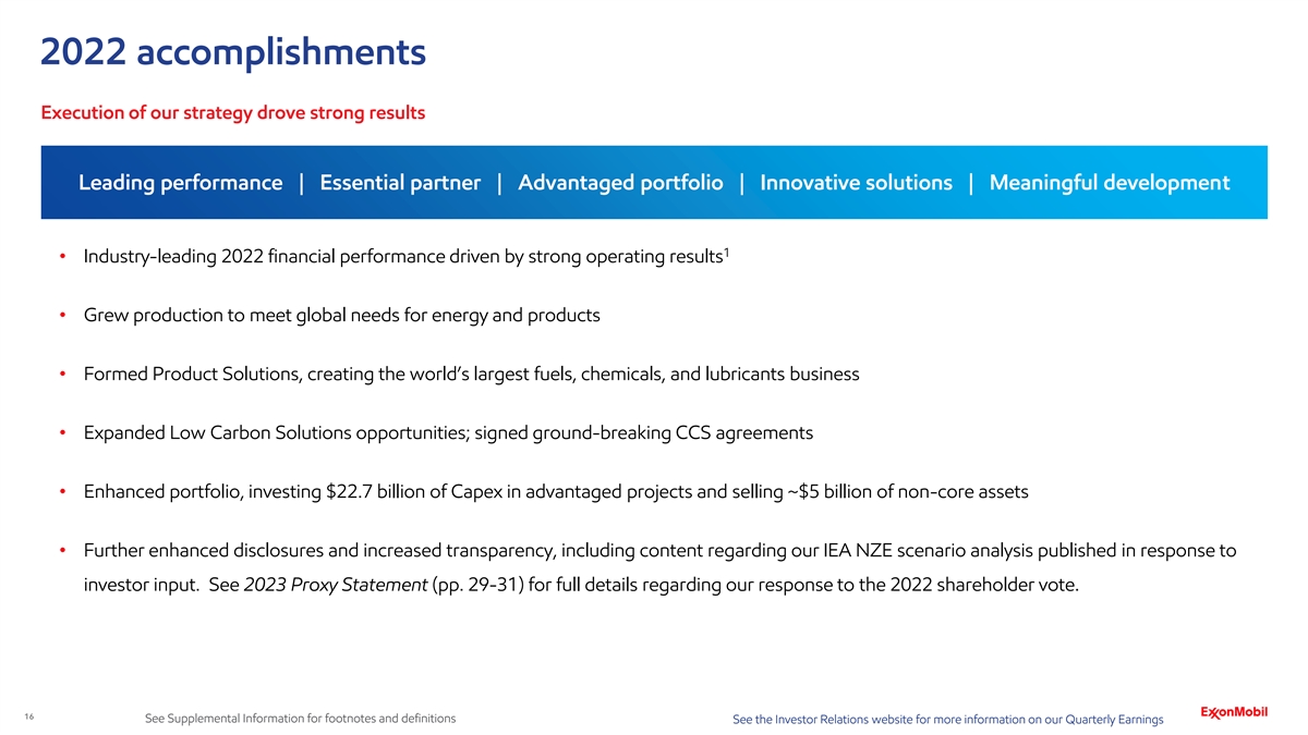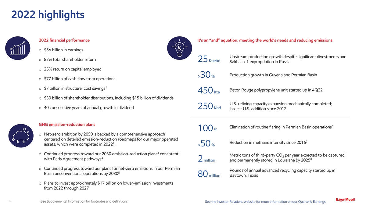 2022 highlights 2022 financial performance It’s an “and” equation: meeting the world’s needs and reducing emissions & o $56 billion in earnings Upstream production growth despite significant divestments and o 87% total shareholder return 25 Koebd Sakhalin-1 expropriation in Russia o 25% return on capital employed Production growth in Guyana and Permian Basin >30 % o $77 billion of cash flow from operations 1 o $7 billion in structural cost savings Baton Rouge polypropylene unit started up in 4Q22 450 Kta o $30 billion of shareholder distributions, including $15 billion of dividends U.S. refining capacity expansion mechanically completed; o 40 consecutive years of annual growth in dividend 250 Kbd largest U.S. addition since 2012 GHG emission-reduction plans 6 Elimination of routine flaring in Permian Basin operations 100 % o Net-zero ambition by 2050 is backed by a comprehensive approach centered on detailed emission-reduction roadmaps for our major operated 7 Reduction in methane intensity since 2016 2 assets, which were completed in 2022 . >50 % 3 o Continued progress toward our 2030 emission-reduction plans consistent Metric tons of third-party CO per year expected to be captured 2 4 with Paris Agreement pathways 8 2 million and permanently stored in Louisiana by 2025 o Continued progress toward our plans for net-zero emissions in our Permian Pounds of annual advanced recycling capacity started up in 5 Basin unconventional operations by 2030 Baytown, Texas 80 million o Plans to invest approximately $17 billion on lower-emission investments from 2022 through 2027 4 See Supplemental Information for footnotes and definitions See the Investor Relations website for more information on our Quarterly Earnings