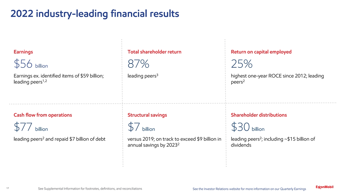 2022 accomplishments Execution of our strategy drove strong results Leading performance | Essential partner | Advantaged portfolio | Innovative solutions | Meaningful development 1 • Industry-leading 2022 financial performance driven by strong operating results • Grew production to meet global needs for energy and products • Formed Product Solutions, creating the world’s largest fuels, chemicals, and lubricants business • Expanded Low Carbon Solutions opportunities; signed ground-breaking CCS agreements • Enhanced portfolio, investing $22.7 billion of Capex in advantaged projects and selling ~$5 billion of non-core assets • Further enhanced disclosures and increased transparency, including content regarding our IEA NZE scenario analysis published in response to investor input. See 2023 Proxy Statement (pp. 29-31) for full details regarding our response to the 2022 shareholder vote. 16 See Supplemental Information for footnotes and definitions See the Investor Relations website for more information on our Quarterly Earnings