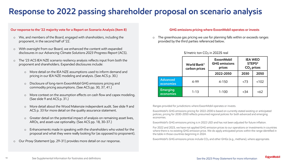 Response to 2022 passing shareholder proposal on scenario analysis Our response to the ‘22 majority vote for a Report on Scenario Analysis (Item 8) GHG emissions pricing where ExxonMobil operates or invests o We, and members of the Board, engaged with shareholders, including the o The greenhouse gas pricing we use for planning falls within or exceeds ranges proponent, in the second half of ’22. provided by the third parties referenced below. o With oversight from our Board, we enhanced the content with expanded disclosures in our Advancing Climate Solutions 2023 Progress Report (ACS). $/metric ton CO₂ in 2022$ real ExxonMobil IEA WEO o The ‘23 ACS IEA NZE scenario resiliency analysis reflects input from both the 2 1 GHG emissions STEPS proponent and shareholders. Expanded disclosures include: World Bank prices CO prices 2 carbon prices o More detail on the IEA NZE assumptions used to inform demand and 2022-2050 2030 2050 pricing in our IEA NZE modeling and analysis. (See ACS p. 30.) Advanced 4-99 4-150 <73 <102 o Disclosure of long-term ExxonMobil GHG emissions pricing and economies commodity pricing assumptions. (See ACS pp. 30, 37, 41.) Emerging 1-13 1-100 <34 <62 economies o More context on the assumption effects on cash flow and capex modeling. (See slide 9 and ACS p. 31.) Ranges provided for jurisdictions where ExxonMobil operates or invests. o More detail about the Wood Makenzie independent audit. See slide 9 and ACS p. 33 for more detail on the quality assurance statement. ExxonMobil’s GHG emissions pricing for 2022-2030 is based on currently stated existing or anticipated policies; pricing for 2030-2050 reflects presumed regional policies for both advanced and emerging economies. o Greater detail on the potential impact of analysis on remaining asset lives, AROs, and asset-use optionality. (See ACS pp. 18, 30-37.) ExxonMobil’s GHG emissions pricing is in 2022 USD and has not been adjusted for future inflation. For 2022 and 2023, we have not applied GHG emission prices to our operations or investments in countries o Enhancements made in speaking with the shareholders who voted for the where there is no existing GHG emission price. We do apply anticipated prices within the range identified in proposal and what they were really looking for (as opposed to proponent). the table in those countries beginning in 2024. ExxonMobil’s GHG emissions prices include CO₂ and other GHGs (e.g., methane), where appropriate. o Our Proxy Statement (pp. 29-31) provides more detail on our response. 18 See Supplemental Information for footnotes and definitions See the 2023 Proxy Statement for more information