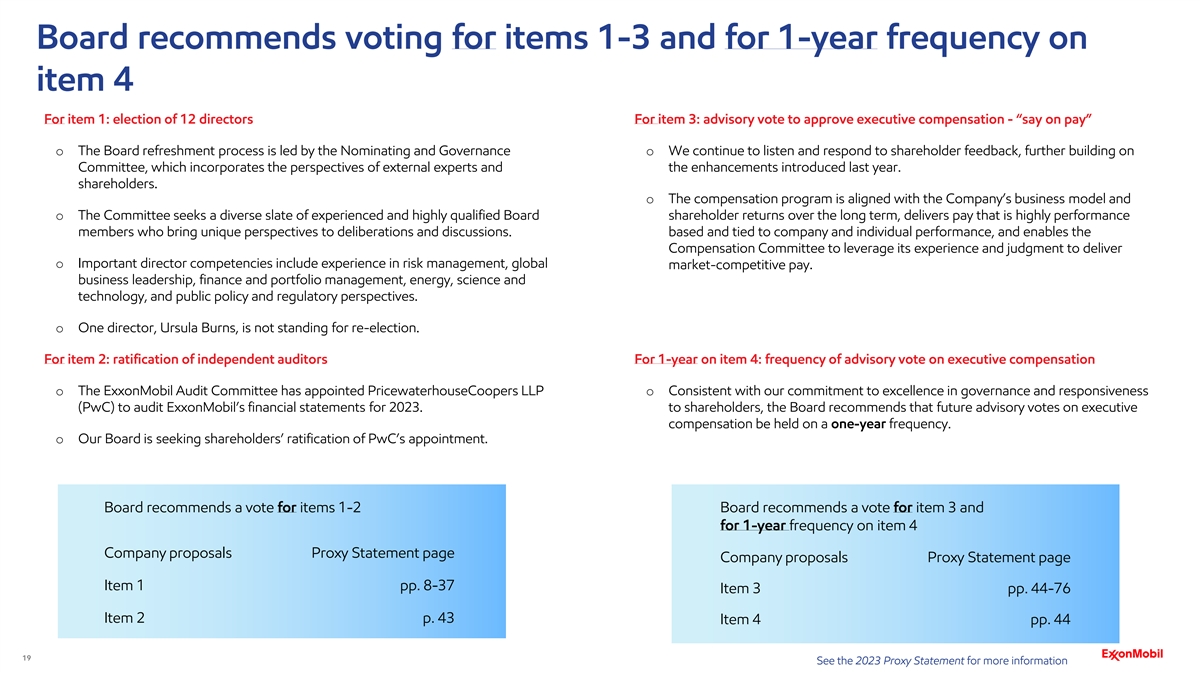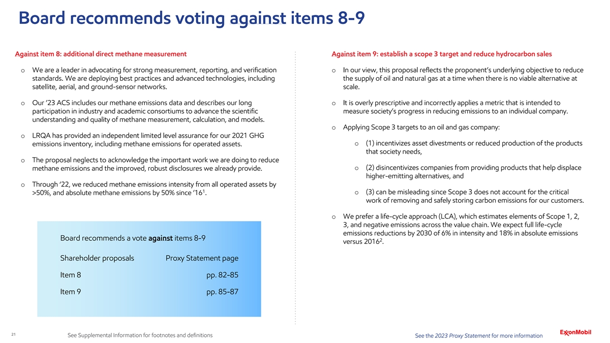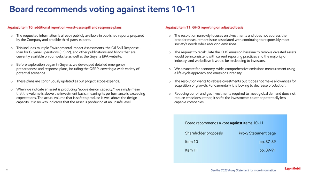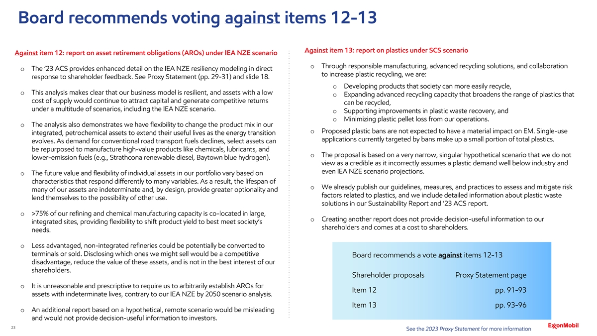 Board recommends voting against items 10-11 Against item 10: additional report on worst-case spill and response plans Against item 11: GHG reporting on adjusted basis o The requested information is already publicly available in published reports prepared o The resolution narrowly focuses on divestments and does not address the by the Company and credible third-party experts. broader measurement issue associated with continuing to responsibly meet society’s needs while reducing emissions. o This includes multiple Environmental Impact Assessments, the Oil Spill Response Plan for Guyana Operations (OSRP), and other publications and filings that are o The request to recalculate the GHG emission baseline to remove divested assets currently available on our website as well as the Guyana EPA website. would be inconsistent with current reporting practices and the majority of industry, and we believe it would be misleading to investors. o Before exploration began in Guyana, we developed detailed emergency preparedness and response plans, including the OSRP, covering a wide variety of o We advocate for economy-wide, comprehensive emissions measurement using potential scenarios. a life-cycle approach and emissions intensity. o These plans are continuously updated as our project scope expands. o The resolution wants to rebase divestments but it does not make allowances for acquisition or growth. Fundamentally it is looking to decrease production. o When we indicate an asset is producing “above design capacity,” we simply mean that the volume is above the investment basis, meaning its performance is exceeding o Reducing our oil and gas investments required to meet global demand does not expectations. The actual volume that is safe to produce is well above the design reduce emissions; rather, it shifts the investments to other potentially less capacity. It in no way indicates that the asset is producing at an unsafe level. capable companies. Board recommends a vote against items 10-11 Shareholder proposals Proxy Statement page Item 10 pp. 87-89 Item 11 pp. 89-91 22 See the 2023 Proxy Statement for more information