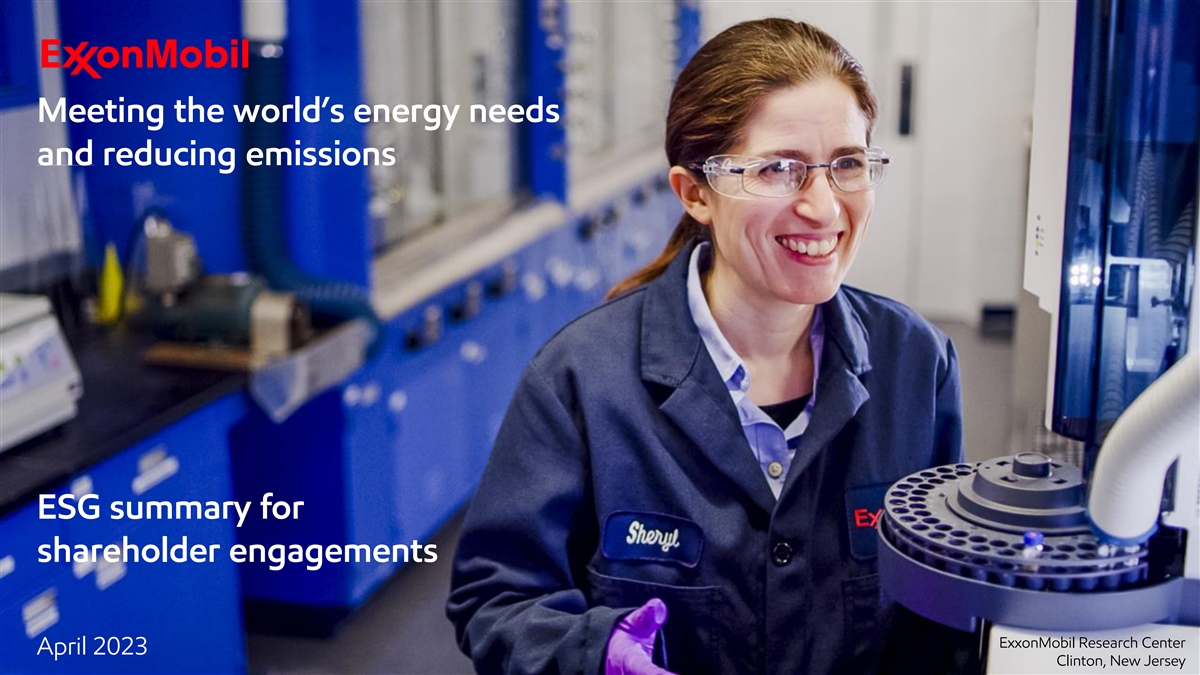 Meeting the world’s energy needs and reducing emissions ESG summary for shareholder engagements ExxonMobil Research Center April 2023 Clinton, New Jersey