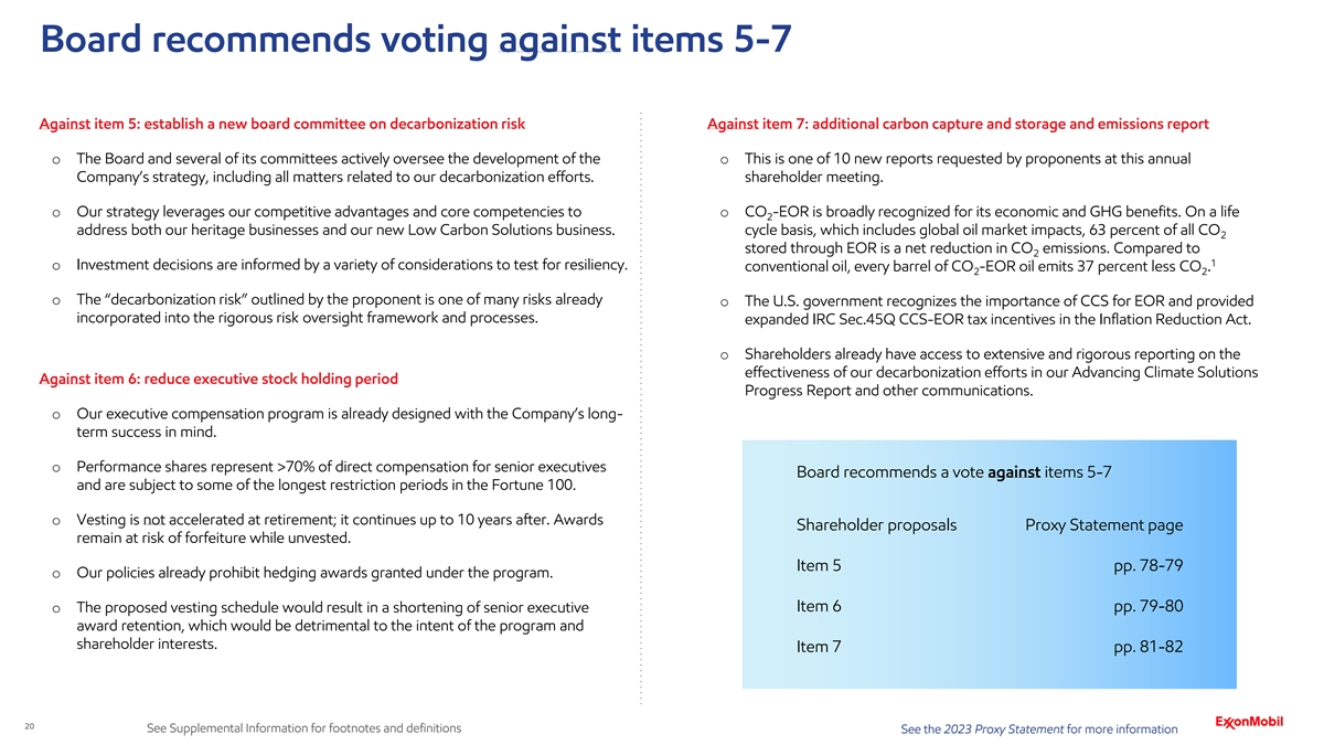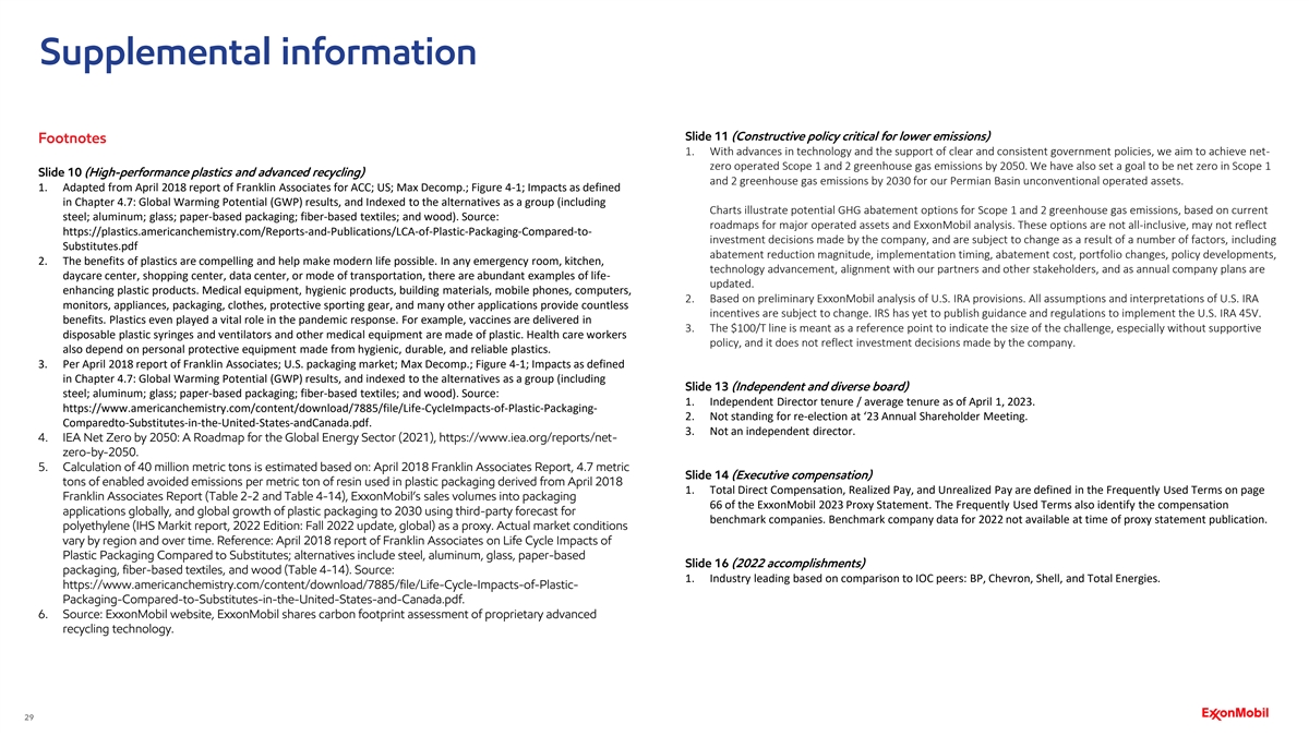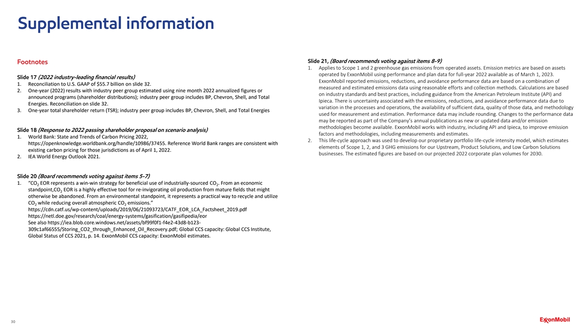 Supplemental information Slide 21, (Board recommends voting against items 8-9) Footnotes 1. Applies to Scope 1 and 2 greenhouse gas emissions from operated assets. Emission metrics are based on assets operated by ExxonMobil using performance and plan data for full-year 2022 available as of March 1, 2023. Slide 17 (2022 industry-leading financial results) ExxonMobil reported emissions, reductions, and avoidance performance data are based on a combination of 1. Reconciliation to U.S. GAAP of $55.7 billion on slide 32. measured and estimated emissions data using reasonable efforts and collection methods. Calculations are based 2. One-year (2022) results with industry peer group estimated using nine month 2022 annualized figures or on industry standards and best practices, including guidance from the American Petroleum Institute (API) and announced programs (shareholder distributions); industry peer group includes BP, Chevron, Shell, and Total Ipieca. There is uncertainty associated with the emissions, reductions, and avoidance performance data due to Energies. Reconciliation on slide 32. variation in the processes and operations, the availability of sufficient data, quality of those data, and methodology 3. One-year total shareholder return (TSR); industry peer group includes BP, Chevron, Shell, and Total Energies used for measurement and estimation. Performance data may include rounding. Changes to the performance data may be reported as part of the Company’s annual publications as new or updated data and/or emission methodologies become available. ExxonMobil works with industry, including API and Ipieca, to improve emission Slide 18 (Response to 2022 passing shareholder proposal on scenario analysis) factors and methodologies, including measurements and estimates. 1. World Bank: State and Trends of Carbon Pricing 2022, 2. This life-cycle approach was used to develop our proprietary portfolio life-cycle intensity model, which estimates https://openknowledge.worldbank.org/handle/10986/37455. Reference World Bank ranges are consistent with elements of Scope 1, 2, and 3 GHG emissions for our Upstream, Product Solutions, and Low Carbon Solutions existing carbon pricing for those jurisdictions as of April 1, 2022. businesses. The estimated figures are based on our projected 2022 corporate plan volumes for 2030. 2. IEA World Energy Outlook 2021. Slide 20 (Board recommends voting against items 5-7) 1. “CO EOR represents a win-win strategy for beneficial use of industrially-sourced CO . From an economic 2 2 standpoint,CO EOR is a highly effective tool for re-invigorating oil production from mature fields that might 2 otherwise be abandoned. From an environmental standpoint, it represents a practical way to recycle and utilize CO while reducing overall atmospheric CO emissions.” 2 2 https://cdn.catf.us/wp-content/uploads/2019/06/21093723/CATF_EOR_LCA_Factsheet_2019.pdf https://netl.doe.gov/research/coal/energy-systems/gasification/gasifipedia/eor See also https://iea.blob.core.windows.net/assets/bf99f0f1-f4e2-43d8-b123- 309c1af66555/Storing_CO2_through_Enhanced_Oil_Recovery.pdf; Global CCS capacity: Global CCS Institute, Global Status of CCS 2021, p. 14. ExxonMobil CCS capacity: ExxonMobil estimates. 30