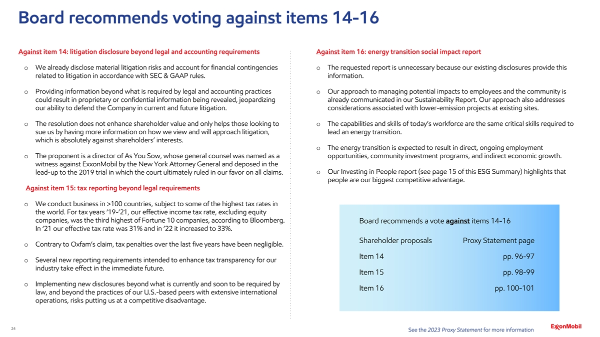 Board recommends voting against items 12-13 Against item 13: report on plastics under SCS scenario Against item 12: report on asset retirement obligations (AROs) under IEA NZE scenario o Through responsible manufacturing, advanced recycling solutions, and collaboration o The ‘23 ACS provides enhanced detail on the IEA NZE resiliency modeling in direct to increase plastic recycling, we are: response to shareholder feedback. See Proxy Statement (pp. 29-31) and slide 18. o Developing products that society can more easily recycle, o This analysis makes clear that our business model is resilient, and assets with a low o Expanding advanced recycling capacity that broadens the range of plastics that cost of supply would continue to attract capital and generate competitive returns can be recycled, under a multitude of scenarios, including the IEA NZE scenario. o Supporting improvements in plastic waste recovery, and o Minimizing plastic pellet loss from our operations. o The analysis also demonstrates we have flexibility to change the product mix in our o Proposed plastic bans are not expected to have a material impact on EM. Single-use integrated, petrochemical assets to extend their useful lives as the energy transition applications currently targeted by bans make up a small portion of total plastics. evolves. As demand for conventional road transport fuels declines, select assets can be repurposed to manufacture high-value products like chemicals, lubricants, and o The proposal is based on a very narrow, singular hypothetical scenario that we do not lower-emission fuels (e.g., Strathcona renewable diesel, Baytown blue hydrogen). view as a credible as it incorrectly assumes a plastic demand well below industry and even IEA NZE scenario projections. o The future value and flexibility of individual assets in our portfolio vary based on characteristics that respond differently to many variables. As a result, the lifespan of o We already publish our guidelines, measures, and practices to assess and mitigate risk many of our assets are indeterminate and, by design, provide greater optionality and factors related to plastics, and we include detailed information about plastic waste lend themselves to the possibility of other use. solutions in our Sustainability Report and ’23 ACS report. o >75% of our refining and chemical manufacturing capacity is co-located in large, o Creating another report does not provide decision-useful information to our integrated sites, providing flexibility to shift product yield to best meet society’s shareholders and comes at a cost to shareholders. needs. o Less advantaged, non-integrated refineries could be potentially be converted to terminals or sold. Disclosing which ones we might sell would be a competitive Board recommends a vote against items 12-13 disadvantage, reduce the value of these assets, and is not in the best interest of our shareholders. Shareholder proposals Proxy Statement page o It is unreasonable and prescriptive to require us to arbitrarily establish AROs for Item 12 pp. 91-93 assets with indeterminate lives, contrary to our IEA NZE by 2050 scenario analysis. Item 13 pp. 93-96 o An additional report based on a hypothetical, remote scenario would be misleading and would not provide decision-useful information to investors. 23 See the 2023 Proxy Statement for more information
